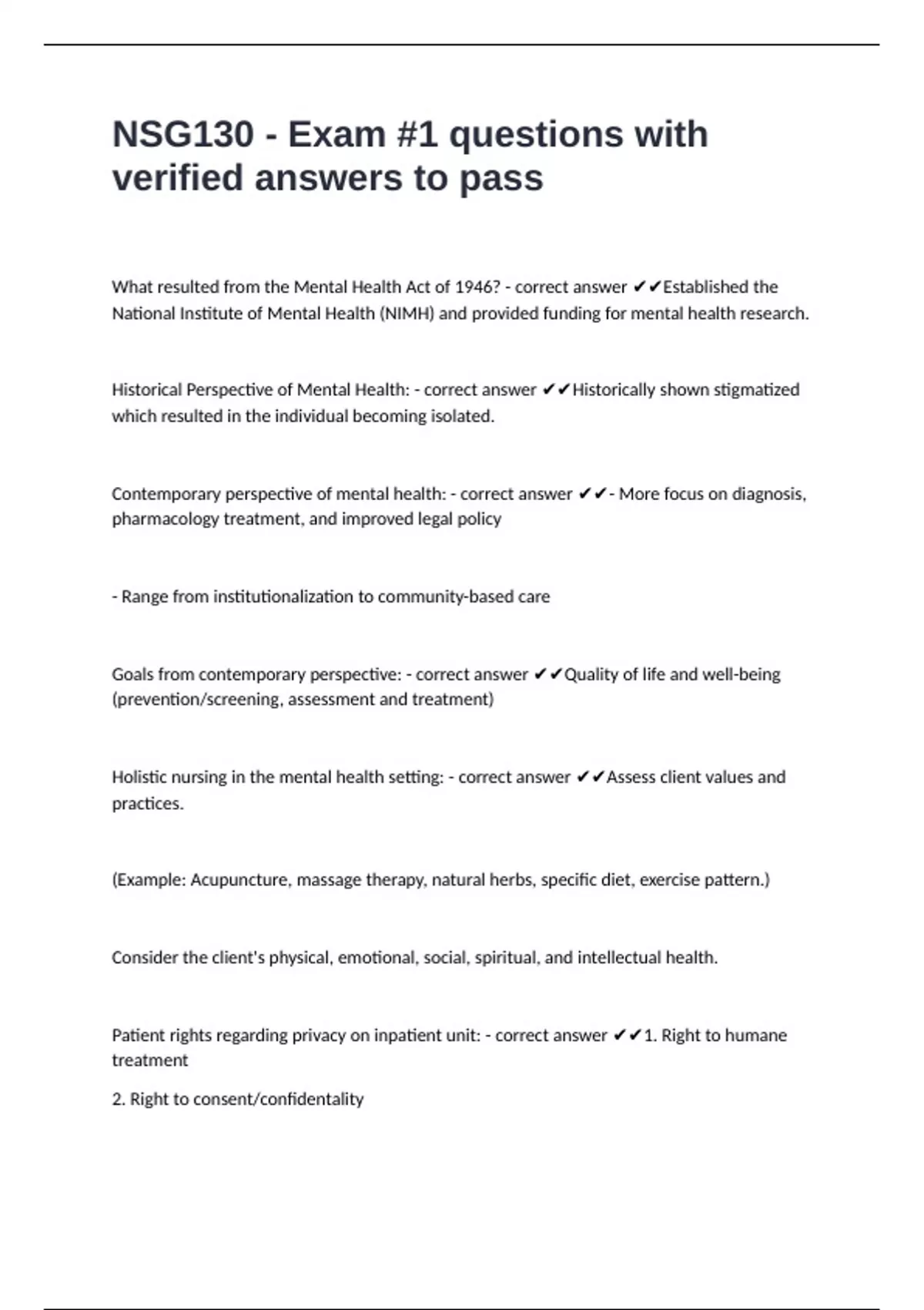 Contemporary perspective of mental health: - correct answer ✔✔- More focus on diagnosis,