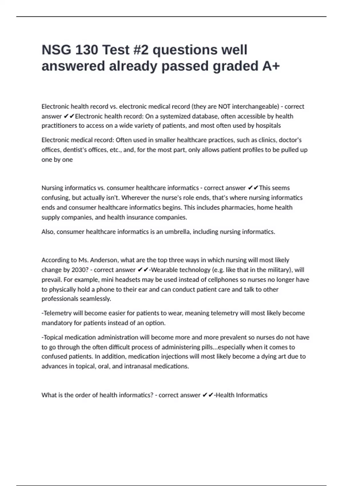 NSG 130 Test #2 questions well answered already passed graded A+