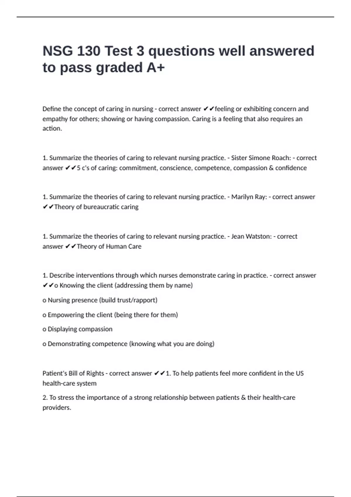 1. Summarize the theories of caring to relevant nursing practice. - Jean Watston: - correct
