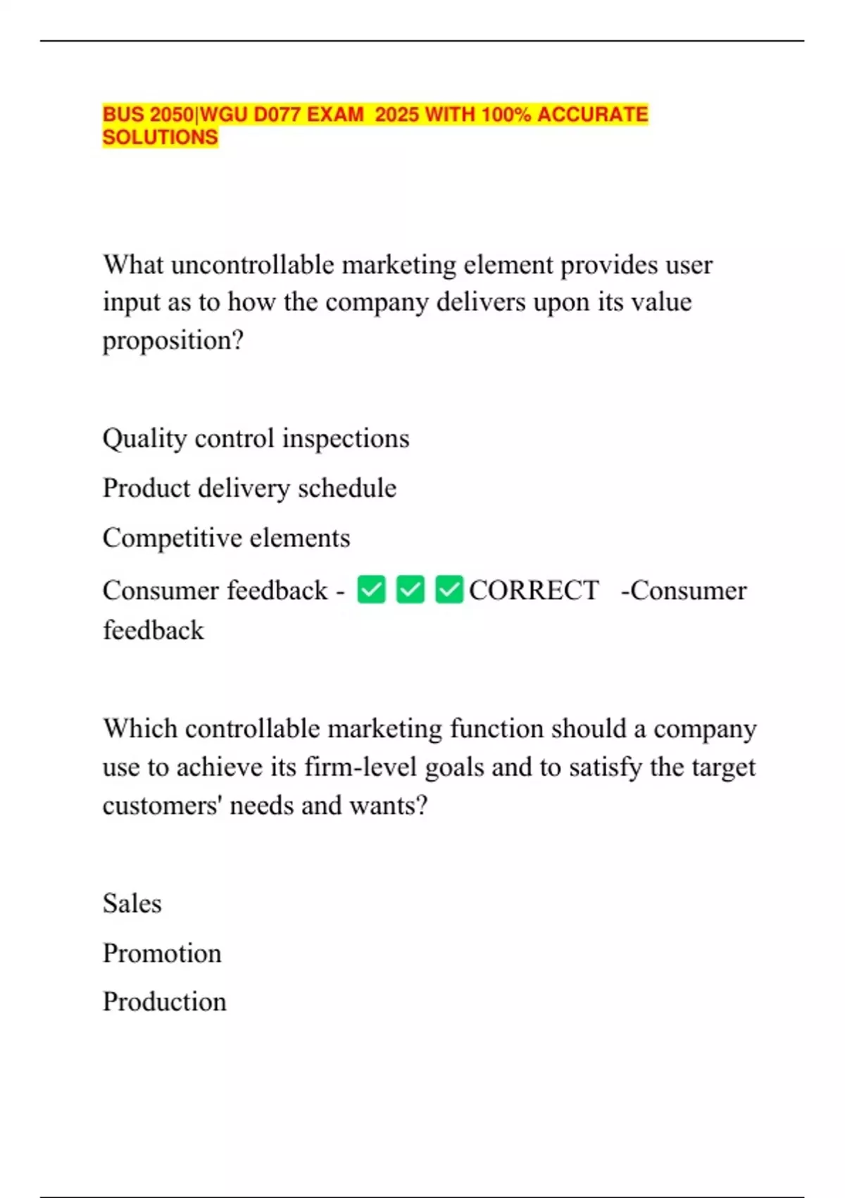 What uncontrollable marketing element provides user input as to how the company delivers upon its value proposition? Quality control inspections Product delivery schedule Competitive elements Consumer feedback - CORRECT -Consumer feedback Which controllable marketing function should a company use to achieve its firm-level goals and to satisfy the target customers' needs and wants? Sales Promotion Productio