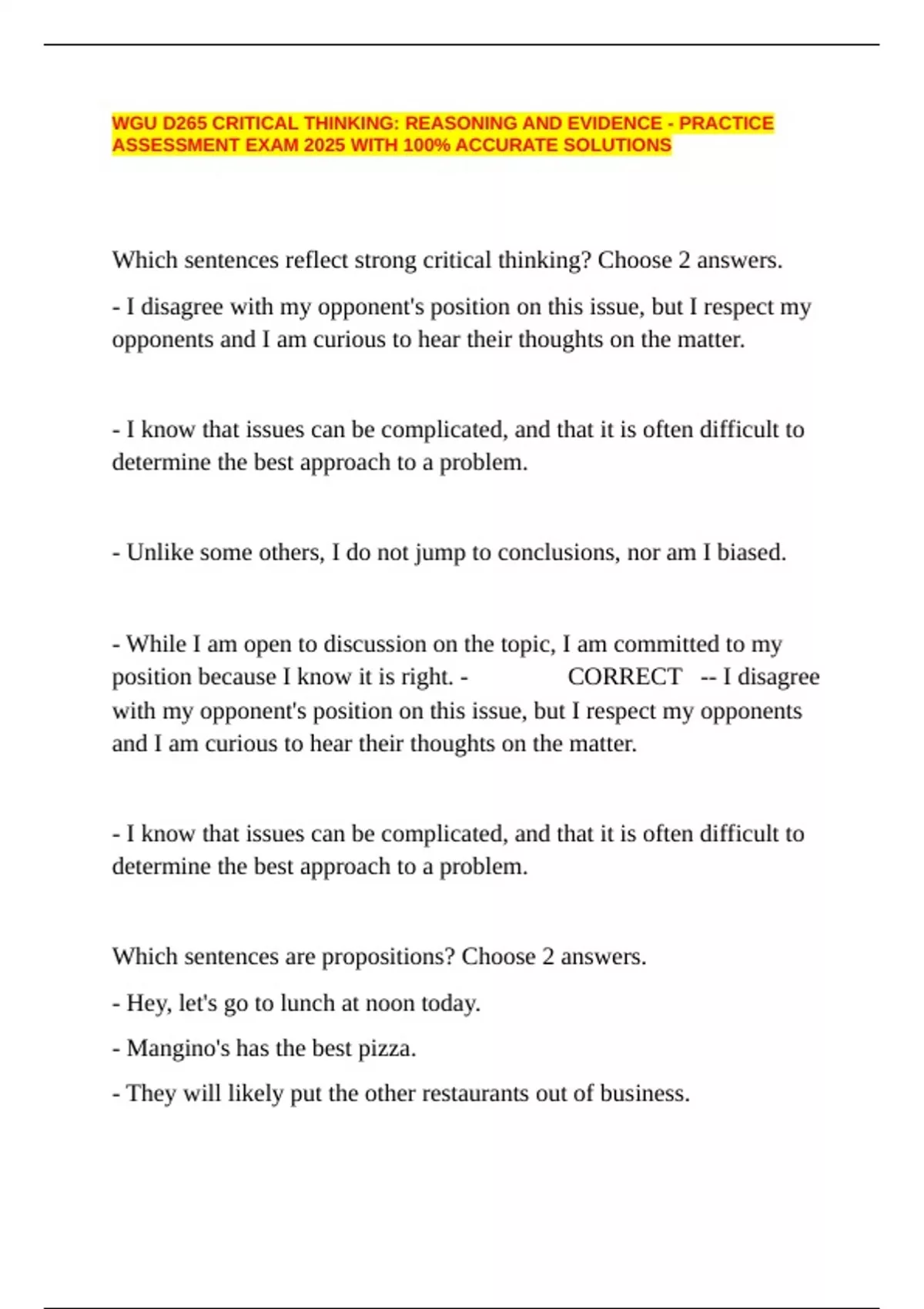 Which sentences reflect strong critical thinking? Choose 2 answers.