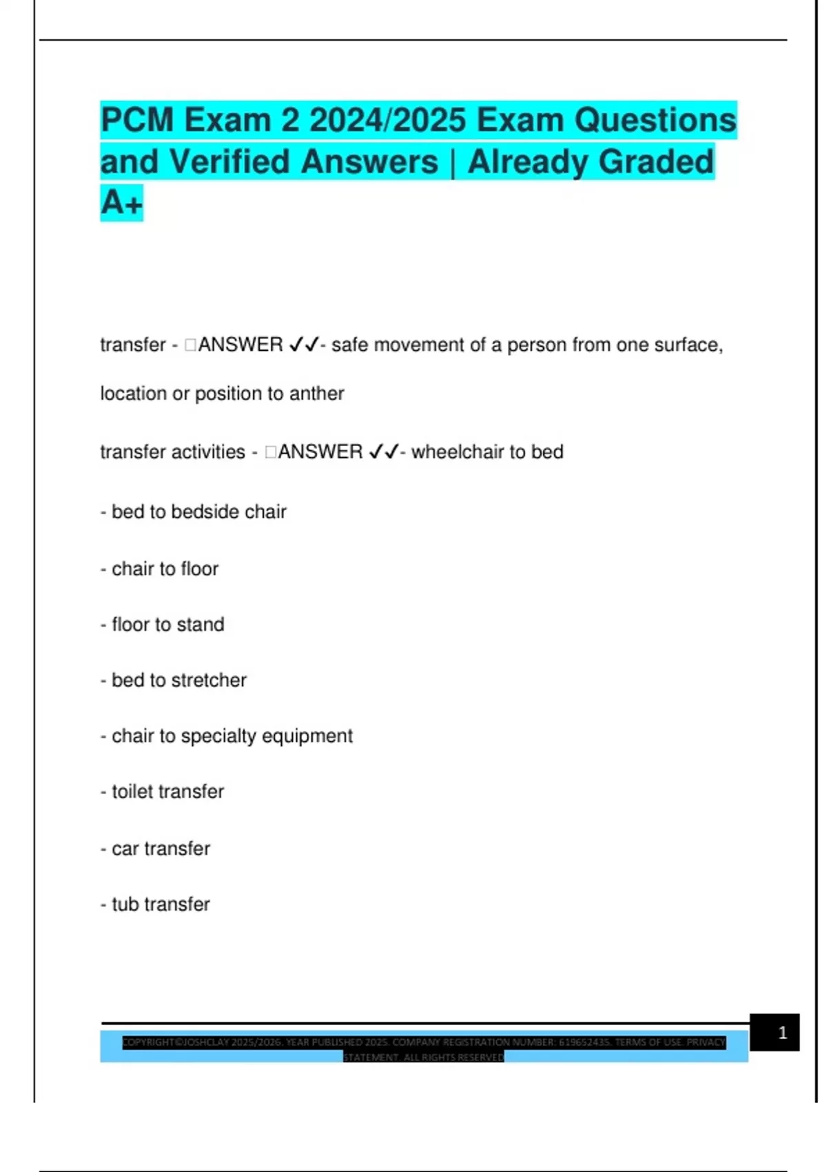 transfer activities - 🧠ANSWER ✔✔- wheelchair to bed