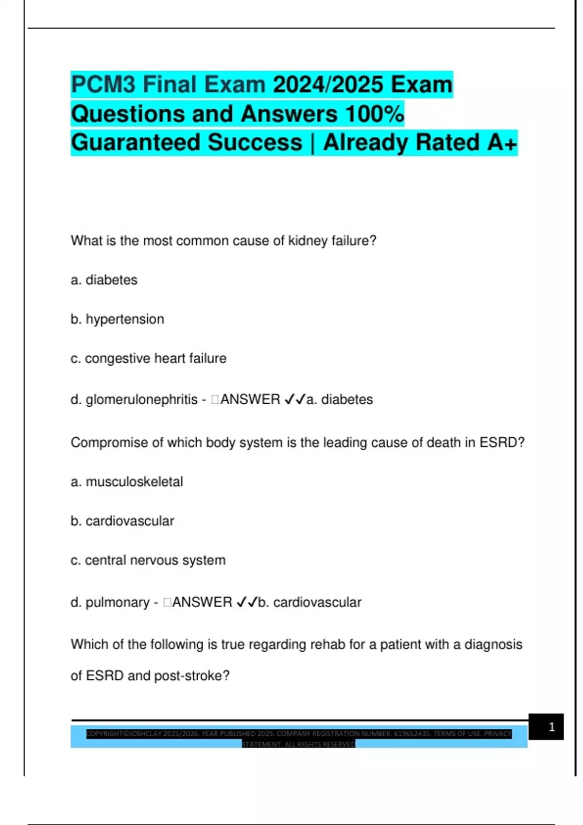 PCM3 Final Exam 2024/2025 Exam Questions and Answers 100% Guaranteed Success | Already Rated A+ What is the most common cause of kidney failure? a. diabetes b. hypertension c. congestive heart failure d. glomerulonephritis -