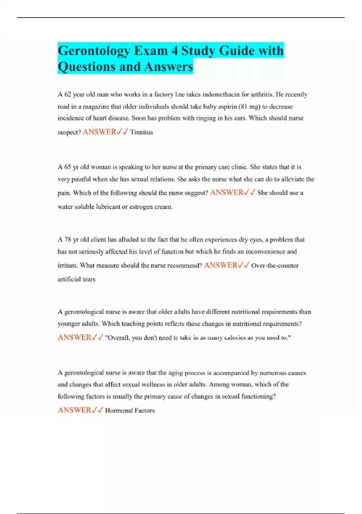 Gerontology Exam 4 Study Guide with Questions and Answers A 62 year old man who works in a factory line takes indomethacin for arthritis. He recently read in a magazine that older individuals should take baby aspirin (81 mg) to decrease incidence of heart disease. Soon has problem with ringing in his ears. Which should nurse suspect? ANSWER Tinnitus A 65 yr old woman is speaking to her nurse at the primary care clinic. She states that it is very painful when she has sexual relations. She asks the nurse what she can do to alleviate the pain. Which of the following should the nurse suggest? ANSWER She should use a water soluble lubricant or estrogen cream. A 78 yr old client has alluded to the fact that he often experiences dry eyes, a problem that has not seriously affected his level of function but which he finds an inconvenience and irritant. What measure should the nurse recommend? ANSWER Over-the-counter artificial tears A gerontological nurse is aware that older adults have different nutritional requirements than younger adults. Which teaching points reflects these changes in nutritional requirements? ANSWER "Overall, you don't need to take in as many calories as you used to." A gerontological nurse is aware that the aging process is accompanied by numerous causes and changes that affect sexual wellness in older adults. Among woman, which of the following factors is usually the primary cause of changes in sexual functioning? ANSWER Hormonal Factors A new nursing assistant asks how best to approach a hearing - impaired older adult. Which of