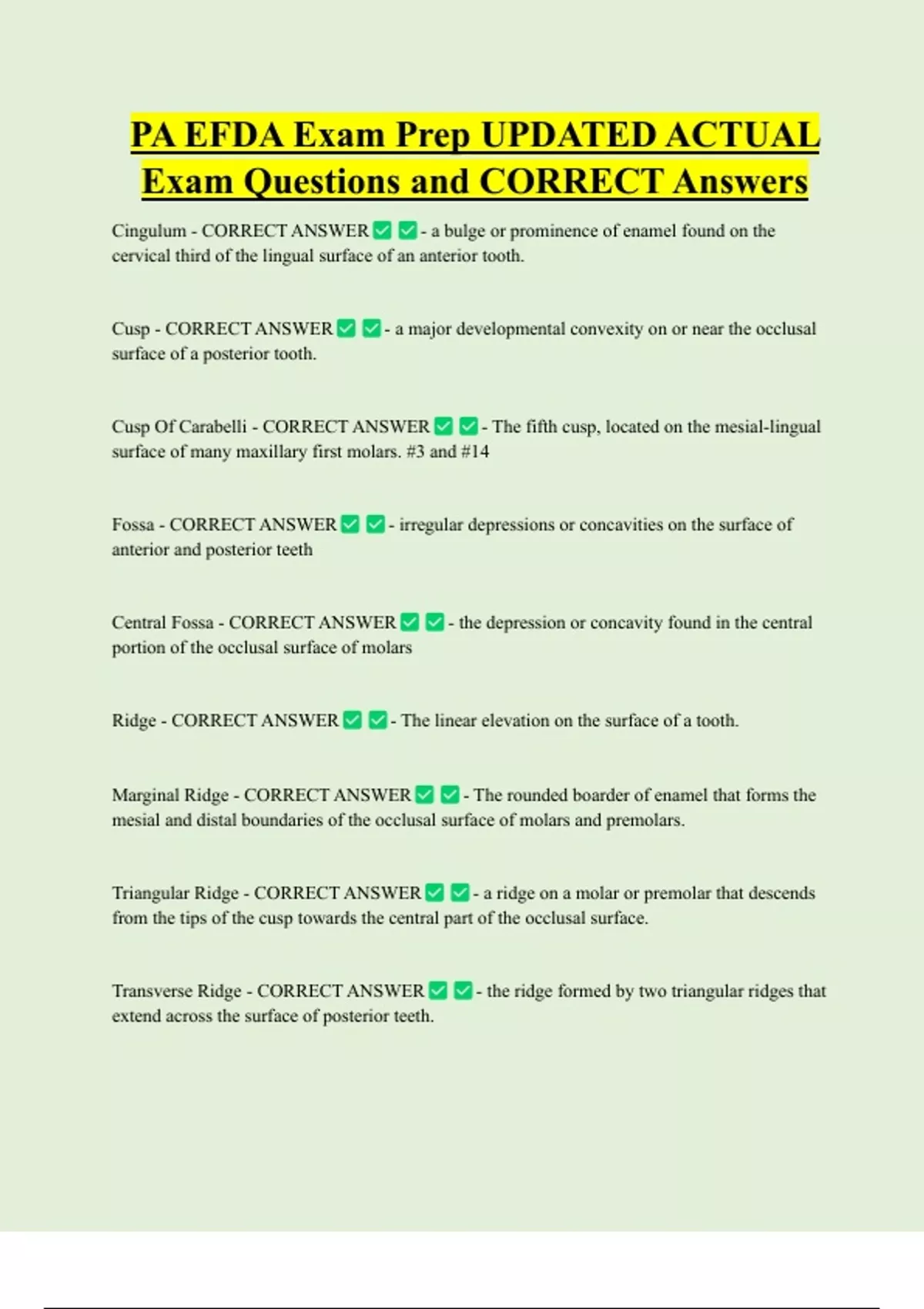 PA EFDA Exam Prep UPDATED ACTUAL Exam Questions and CORRECT Answers Cingulum - CORRECT ANSWER - a bulge or prominence of enamel found on the cervical third of the lingual surface of an anterior tooth. Cusp - CORRECT ANSWER surface of a posterior tooth. - a major developmental convexity on or near the occlusal Cusp Of Carabelli - CORRECT ANSWER - The fifth cusp, located on the mesial-lingual surface of many maxillary first molars. #3 and #14 Fossa - CORRECT ANSWER anterior and posterior teeth - irregular depressions or concavities on the surface of