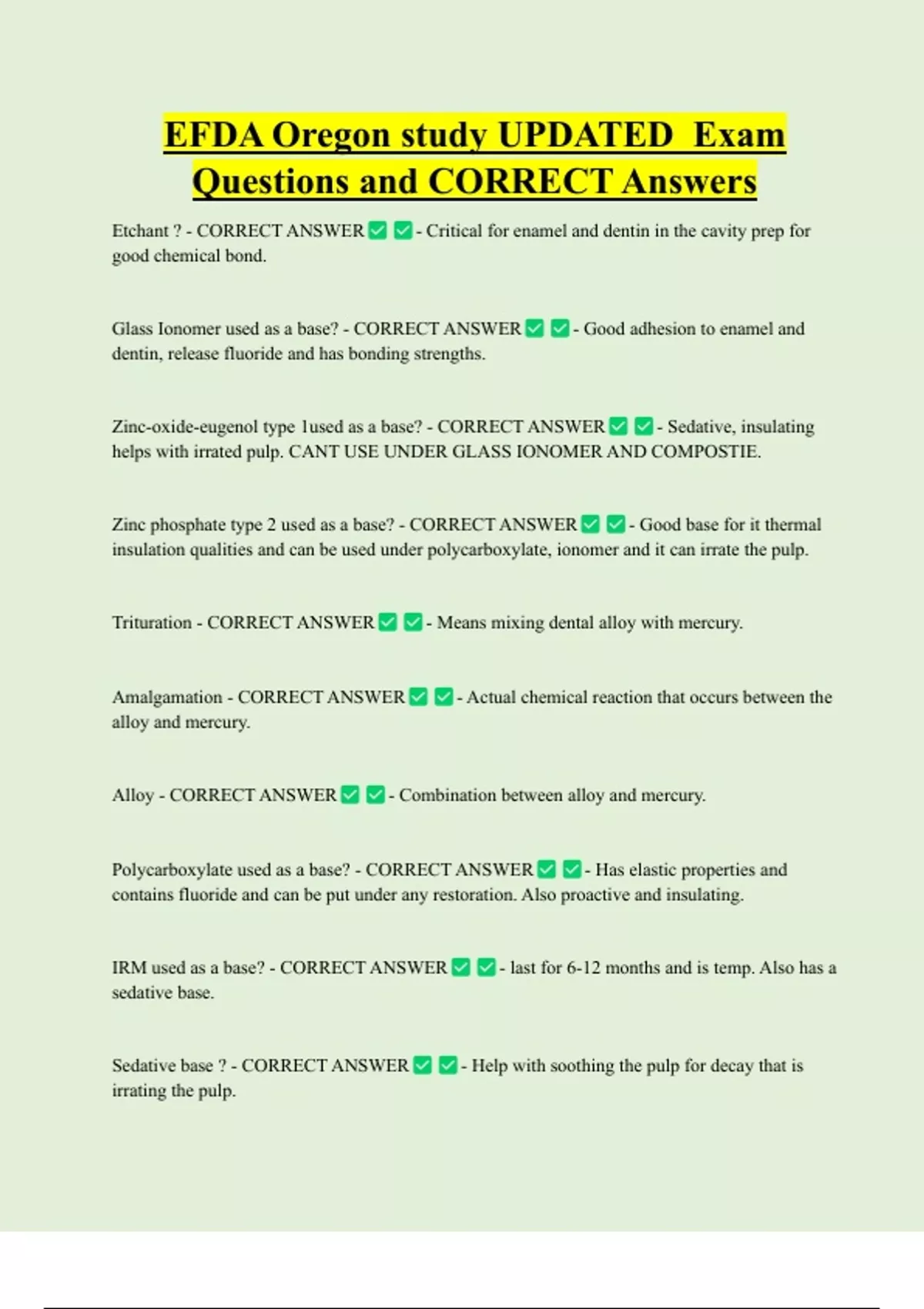 Zinc-oxide-eugenol type 1used as a base? - CORRECT ANSWER - Sedative, insulating