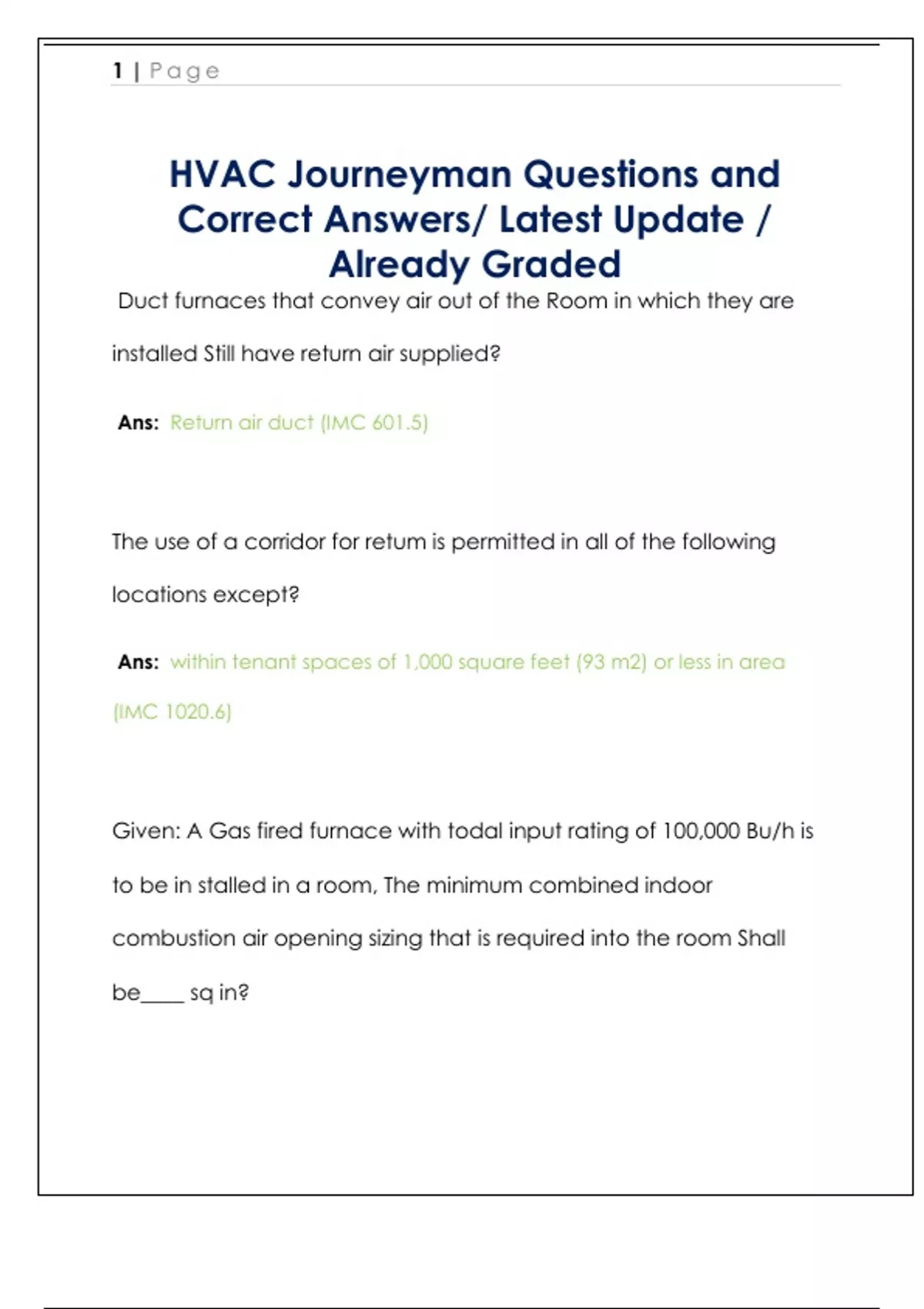 Duct furnaces that convey air out of the Room in which they are installed Still have return air supplied? Ans: Return air duct (IMC 601.5) The use of a corridor for retum is permitted in all of the following locations except? Ans: within tenant spaces of 1,000 square feet (93 m2) or less in area (IMC 1020.6) Given: A Gas fired furnace with todal input rating of 100,000 Bu/h is to be in stalled in a room, The minimum combined indoor combustion air opening sizing that is required into the room Shall be____ sq in? 2 | Page Ans: 50 sq in Given: A Gas fired furnace with a input of 148,000 Btu is to be provided with Combustion Air through Horizonal Quets The minimum size free air opening that must be provided is____sq in? Ans: 148 The minimum distanc