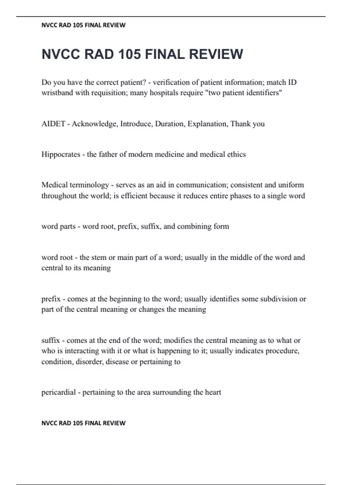 Do you have the correct patient? - verification of patient information; match ID wristband with requisition; many hospitals require "two patient identifiers" AIDET - Acknowledge, Introduce, Duration, Explanation, Thank you Hippocrates - the father of modern medicine and medical ethics Medical terminology - serves as an aid in communication; consistent and uniform throughout the world; is efficient because it reduces entire phases to a single word word parts - word root, prefix, suffix, and combining form word root - the stem or main part of a word; usually in the middle of the word and central to its meaning prefix - comes at the beginning to the word; usually identifies some subdivision or part of the central meaning or changes the meaning suffix - comes at the end of the word; modifies the central meaning as to what or who is interacting with it or what is happening to it; usually indicates procedure, condition, disorder, disease or pertaining to pericardial - pertaining to the area surrounding the heart epigastric - pertaining to the area above the stomach rules for combining - the combining vowel is not used when the suffix begins with a vowel; the combining vowel is used when the suffix begins with a consonant myocarditis - muscle heart inflammation