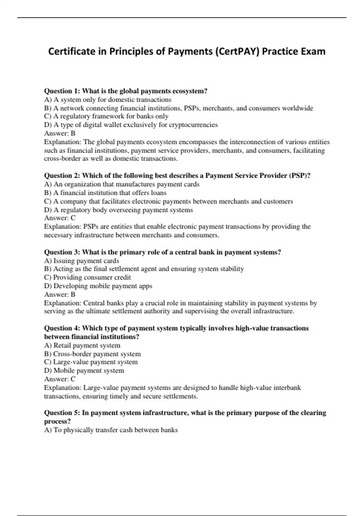 Question 5: In payment system infrastructure, what is the primary purpose of the clearing