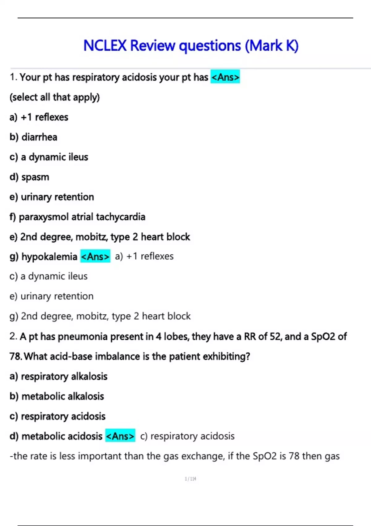 1. Your pt has respiratory acidosis your pt has <Ans>