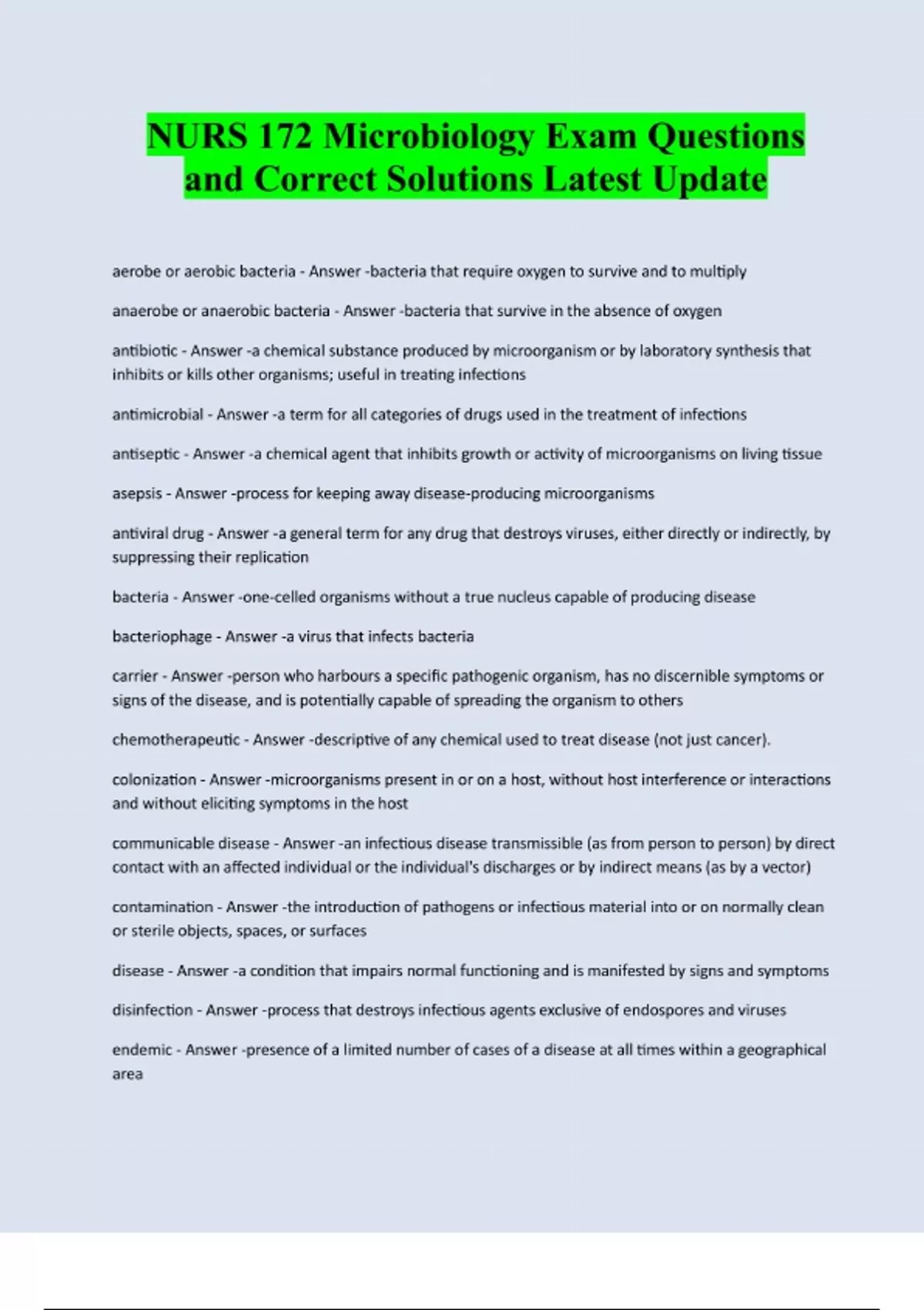 NURS 172 Microbiology Exam Questions and Correct Solutions Latest Update