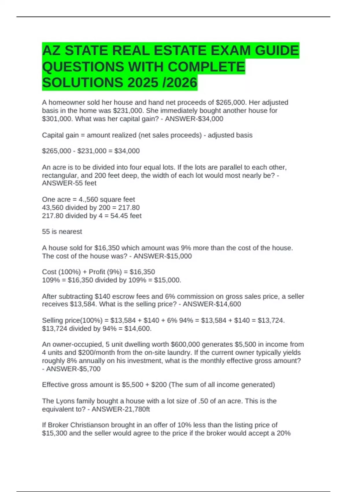 AZ STATE REAL ESTATE EXAM GUIDE QUESTIONS WITH COMPLETE SOLUTIONS 2025 /2026