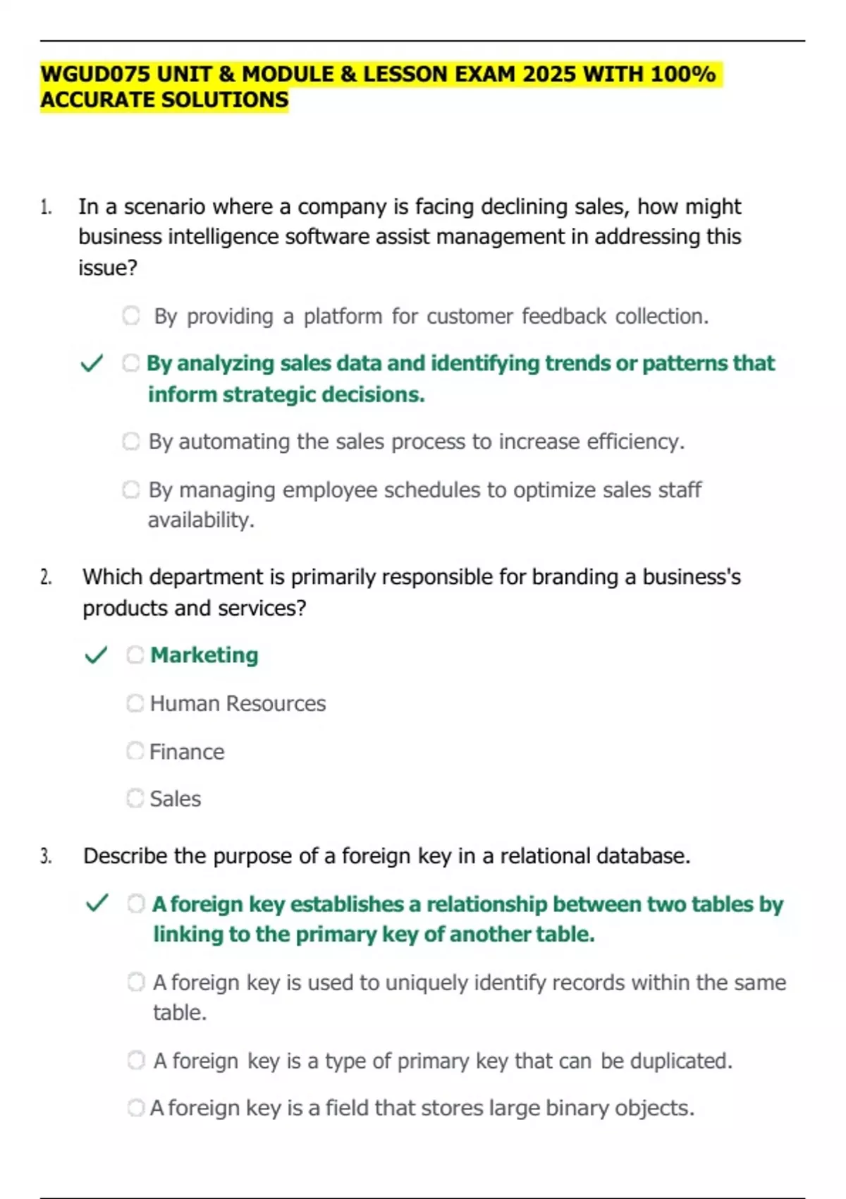 In a scenario where a company is facing declining sales, how might business intelligence software assist management in addressing this issue? By providing a platform for customer feedback collection. By analyzing sales data and identifying trends or patterns that inform strategic decisions. By automating the sales process to increase efficiency. By managing employee schedules to optimize sales staff availability. 2. Which department is primarily responsible for branding a business's products and services? Marketing Human Resources Finance Sales 3. Describe the purpose of a foreign key in a relational database. A foreign key establishes a relationship between two tables by linking to the primary key of another table. A foreign key is used to uniquely identify records within the same table.