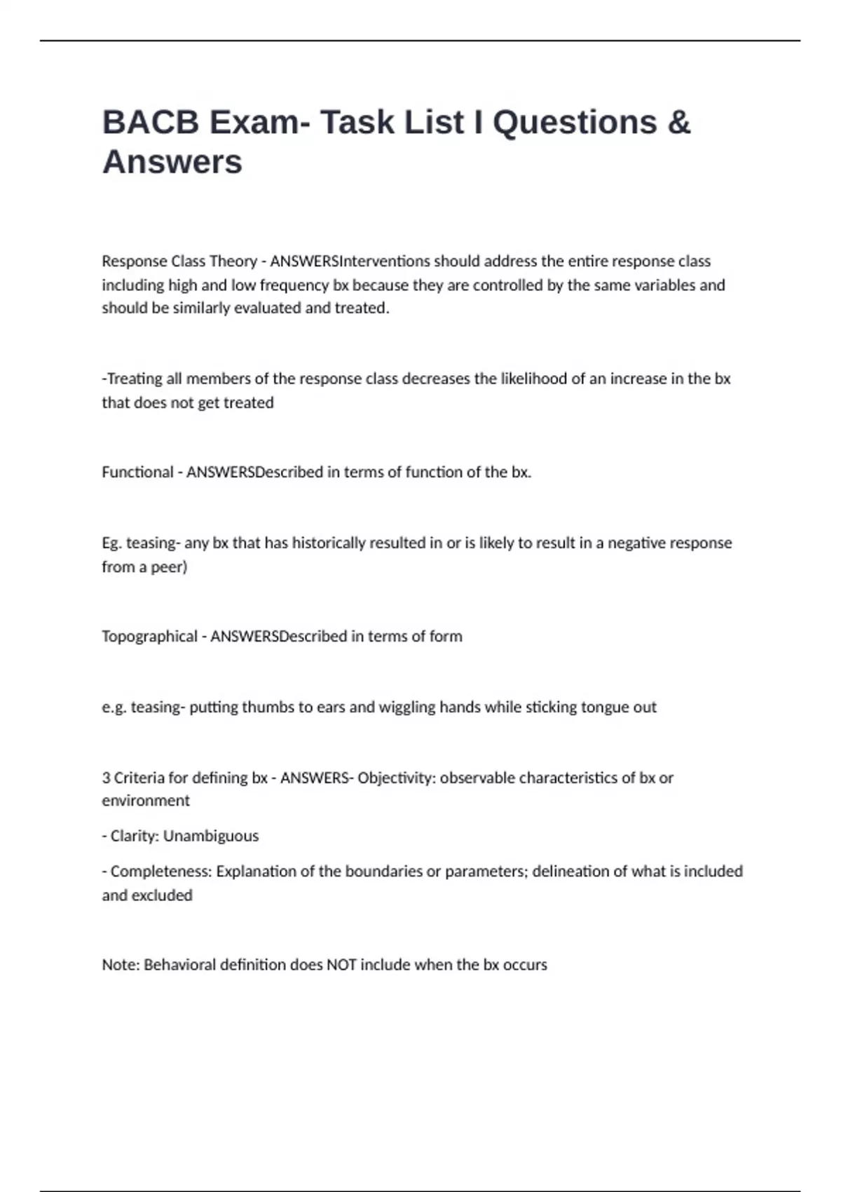 BACB Exam- Task List I Questions & Answers Response Class Theory - ANSWERSInterventions should address the entire response class including high and low frequency bx because they are controlled by the same variables and should be similarly evaluated and treated. -Treating all members of the response class decreases the likelihood of an increase in the bx that does not get treated Functional - ANSWERSDescribed in terms of function of the bx. Eg. teasing- any bx that has historically resulted in or is likely to result in a negative response from a peer) Topographical - ANSWERSDescribed in terms of form e.g. teasing- putting thumbs to ears and wiggling hands while sticking tongue out 3 Criteria for defining bx - ANSWERS- Objectivity: observable characteristics of bx or environment - Clarity: Unambiguous - Completeness: Explanation of the boundaries or parameters; delineation of what is included and excluded Note: Behavioral definition does NOT include when the bx occurs