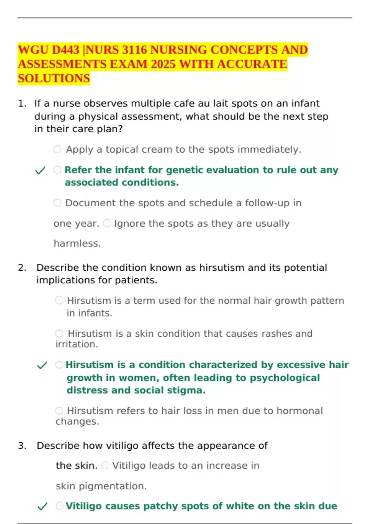 1. If a nurse observes multiple cafe au lait spots on an infant during a physical assessment, what should be the next step in their care plan? Apply a topical cream to the spots immediately. Refer the infant for genetic evaluation to rule out any associated conditions. Document the spots and schedule a follow-up in one year. Ignore the spots as they are usually harmless. 2. Describe the condition known as hirsutism and its potential implications for patients. Hirsutism is a term used for the normal hair growth pattern in infants. Hirsutism is a skin condition that causes rashes and irritation. Hirsutism is a condition characterized by excessive hair growth in women, often leading to psychological distress and social stigma. Hirsutism refers to hair loss in men due to hormonal changes. 3. Describe how vitiligo affects the appearance of the skin. Vitiligo leads to an increase in skin pigmentation. Vitiligo causes patchy spots of white on the skin due to the loss of melanin. Vitiligo causes the skin to become excessively oily. Vitiligo results in a uniform skin tone without discoloration.