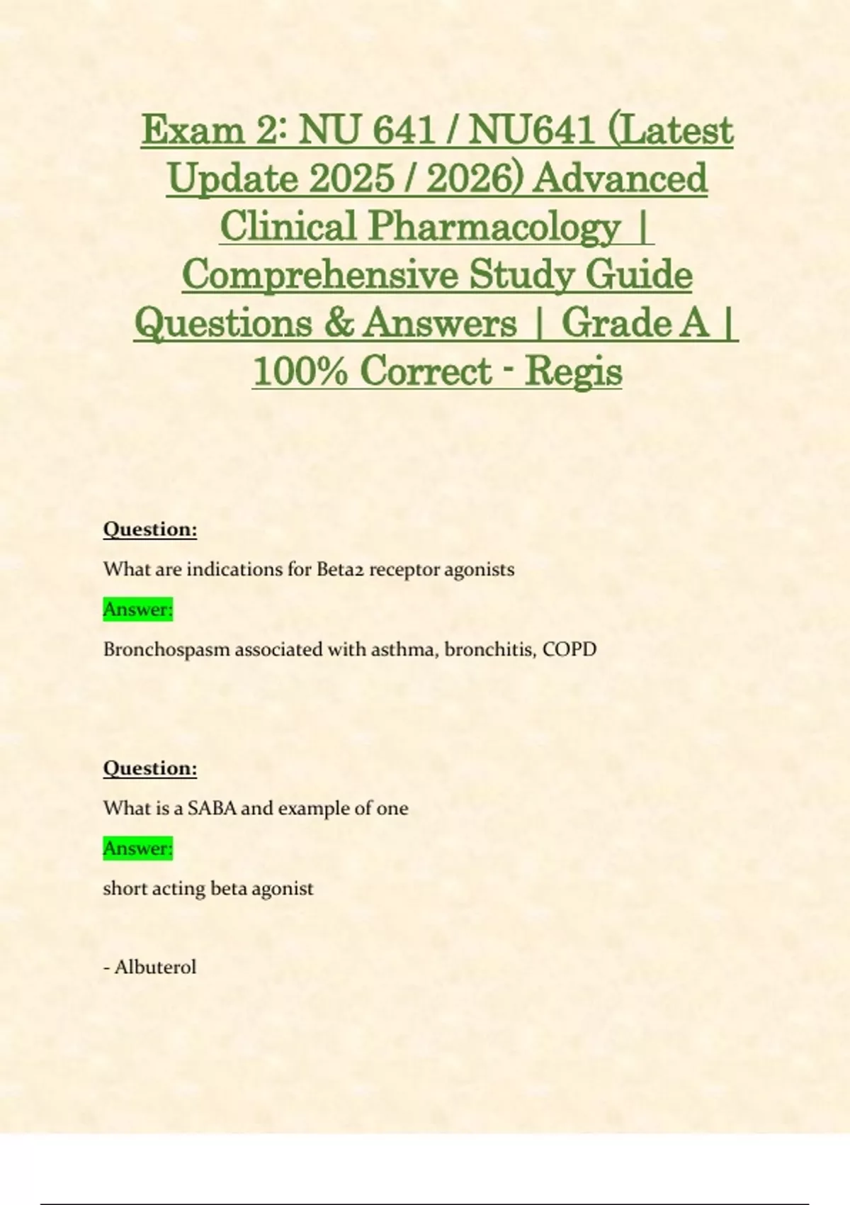 Exam 2: NU 641 / NU641 (Latest Update 2025 / 2026) Advanced Clinical Pharmacology | Comprehensive Study Guide Questions & Answers | Grade A | 100% Correct - Regis Question: What are indications for Beta2 receptor agonists Answer: Bronchospasm associated with asthma, bronchitis, COPD Question: What is a SABA and example of one Answer: short acting beta agonist - Albuterol Question: What is a LABA and example of one Answer: Long acting beta agonist - Salmeterol -Arformentol Question: What is albuterol usually paired with? Answer: ipratropium Question: What pregnancy class is terbutaline Answer: Category B Question: Pharmacokinetics of Levalbuterol Answer: Short acting - just over 3 hours up to 6.