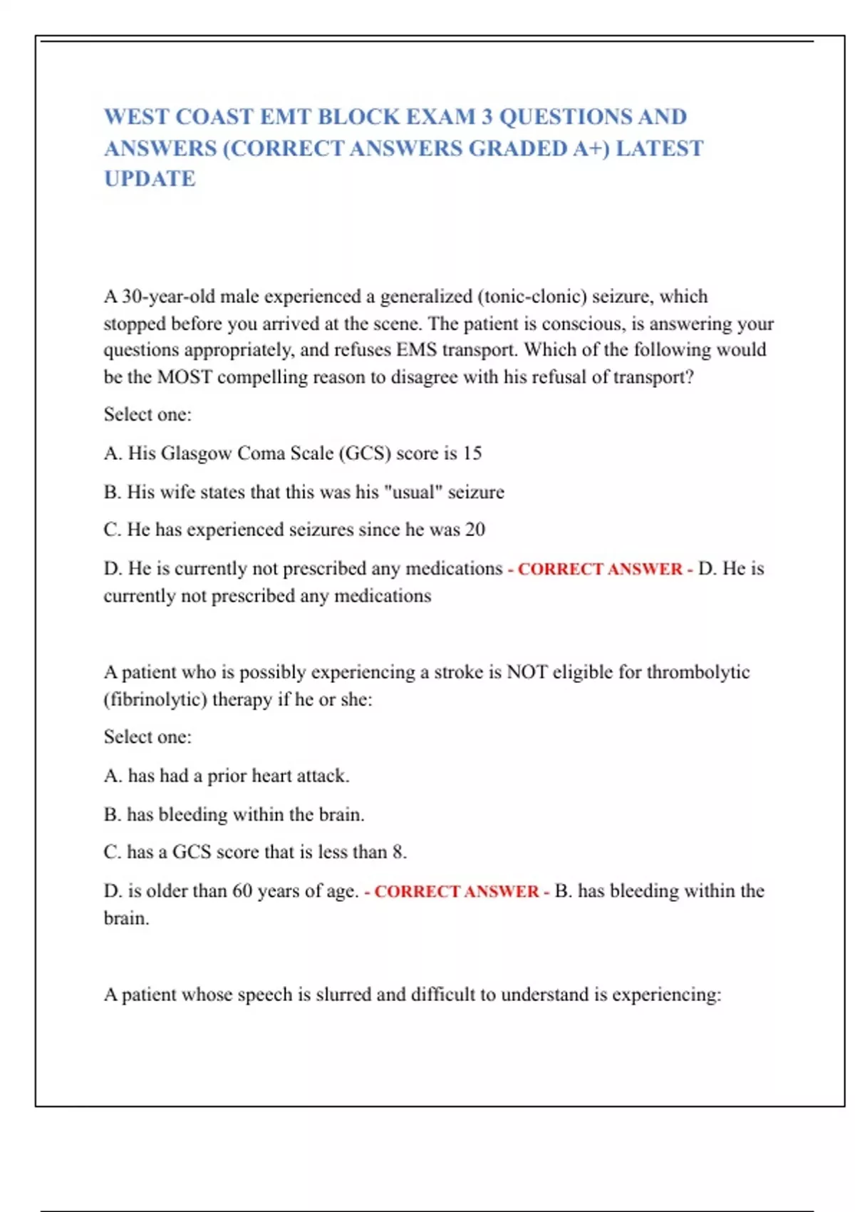 WEST COAST EMT BLOCK EXAM 3 QUESTIONS AND