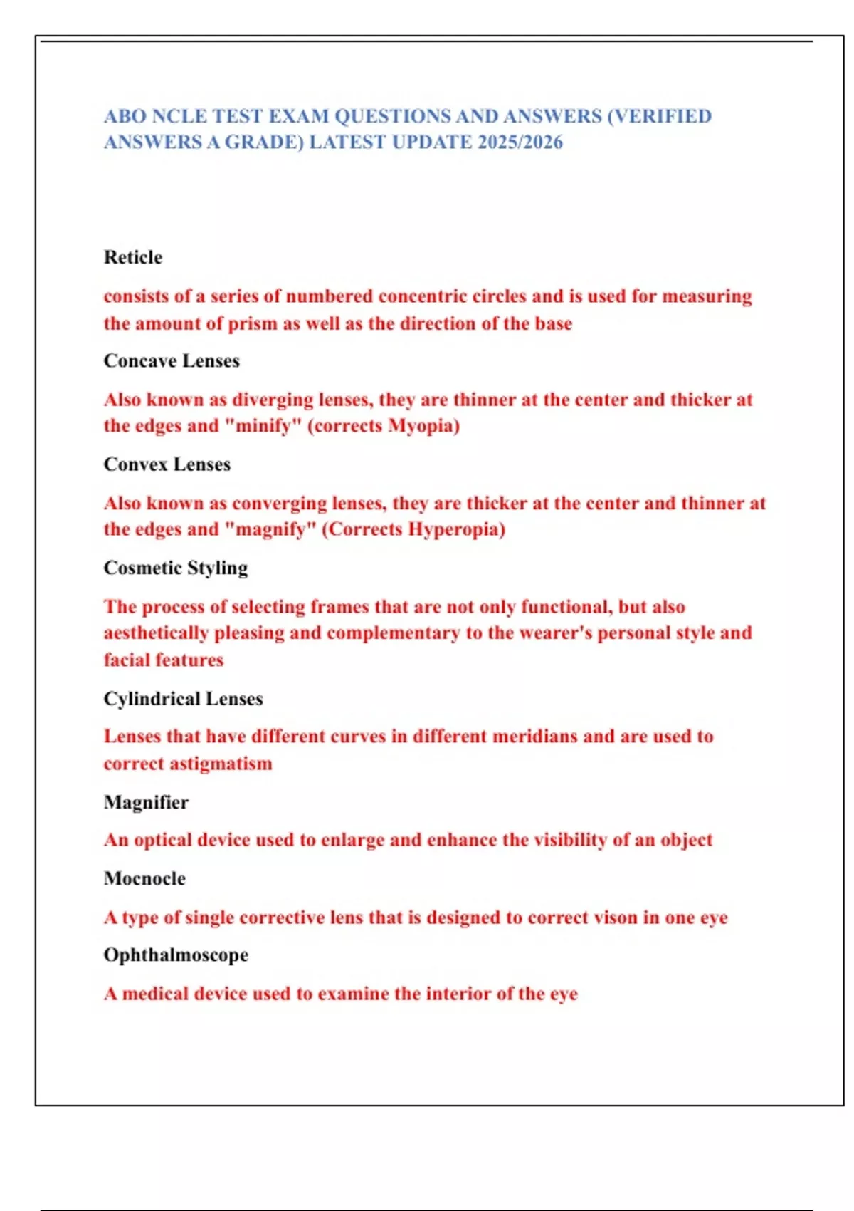 ABO NCLE TEST EXAM QUESTIONS AND ANSWERS (VERIFIED