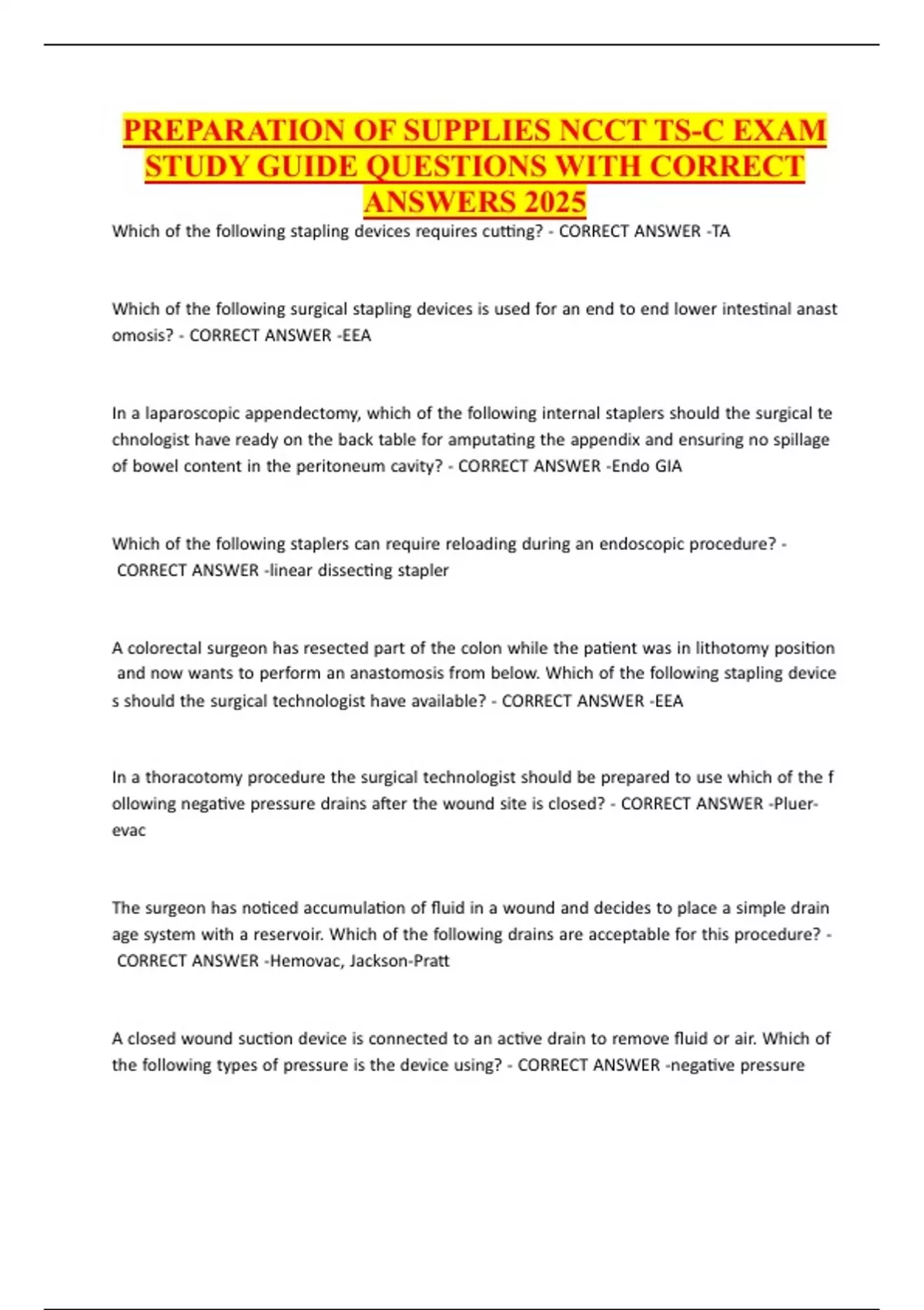 PREPARATION OF SUPPLIES NCCT TS-C EXAM STUDY GUIDE QUESTIONS WITH CORRECT ANSWERS 2025
