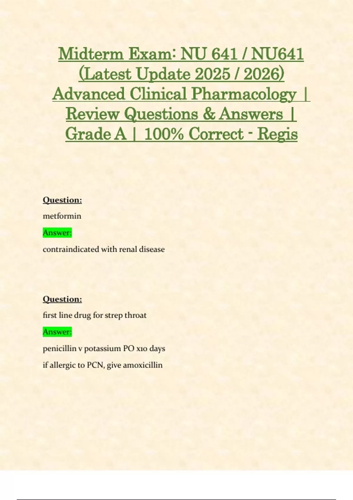 Midterm Exam: NU 641 / NU641 (Latest Update 2025 / 2026) Advanced Clinical Pharmacology | Review Questions & Answers | Grade A | 100% Correct - Regis Question: metformin Answer: contraindicated with renal disease Question: first line drug for strep throat Answer: penicillin v potassium PO x10 days if allergic to PCN, give amoxicillin Question: before prescribing antiHTN meds to newly diagnosed pt Answer: EKG & blood work Question: thiazide diuretics Answer: -cause ED -first line of tx for uncomplicated stage I HTN