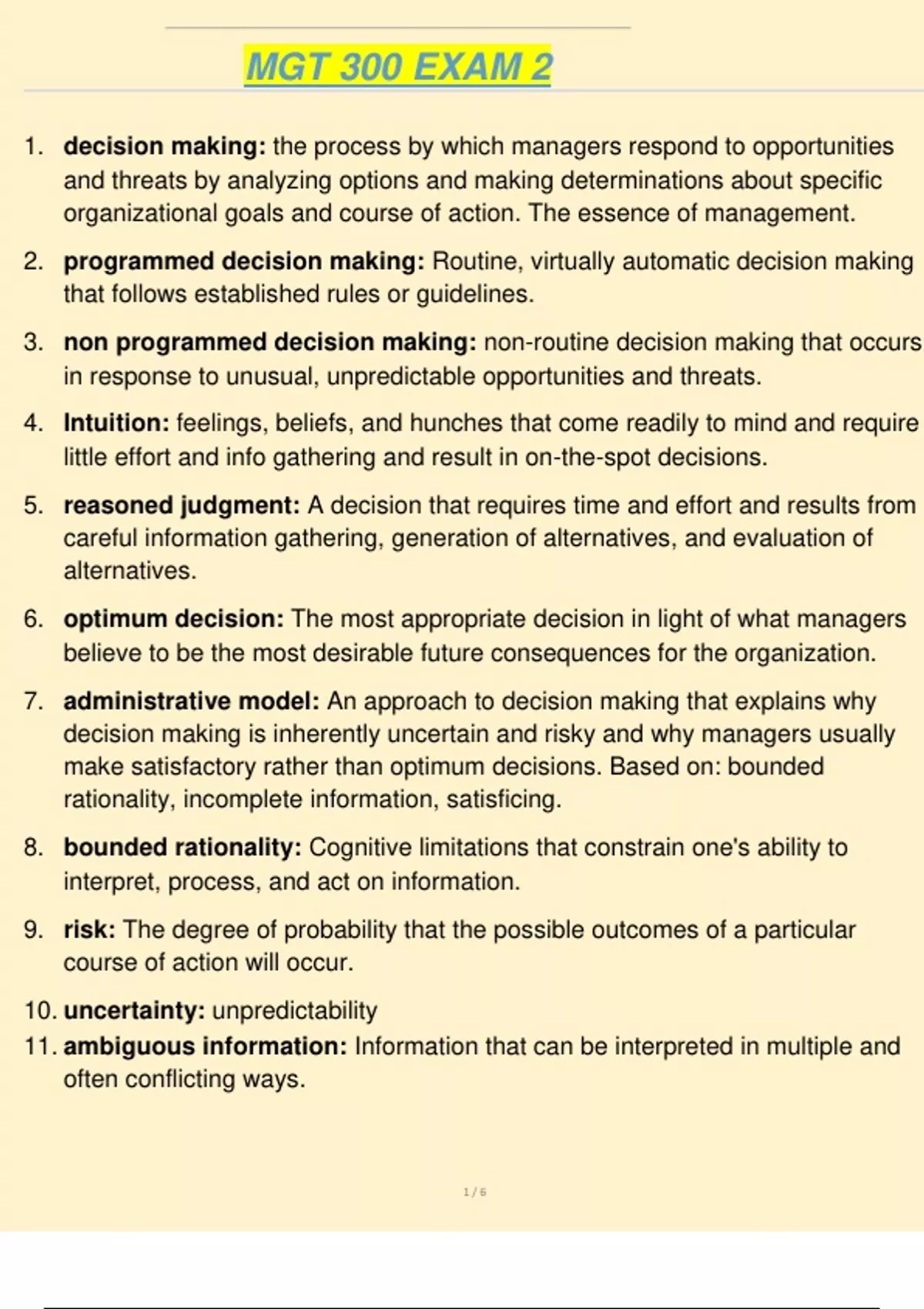 6. optimum decision: The most appropriate decision in light of what managers
