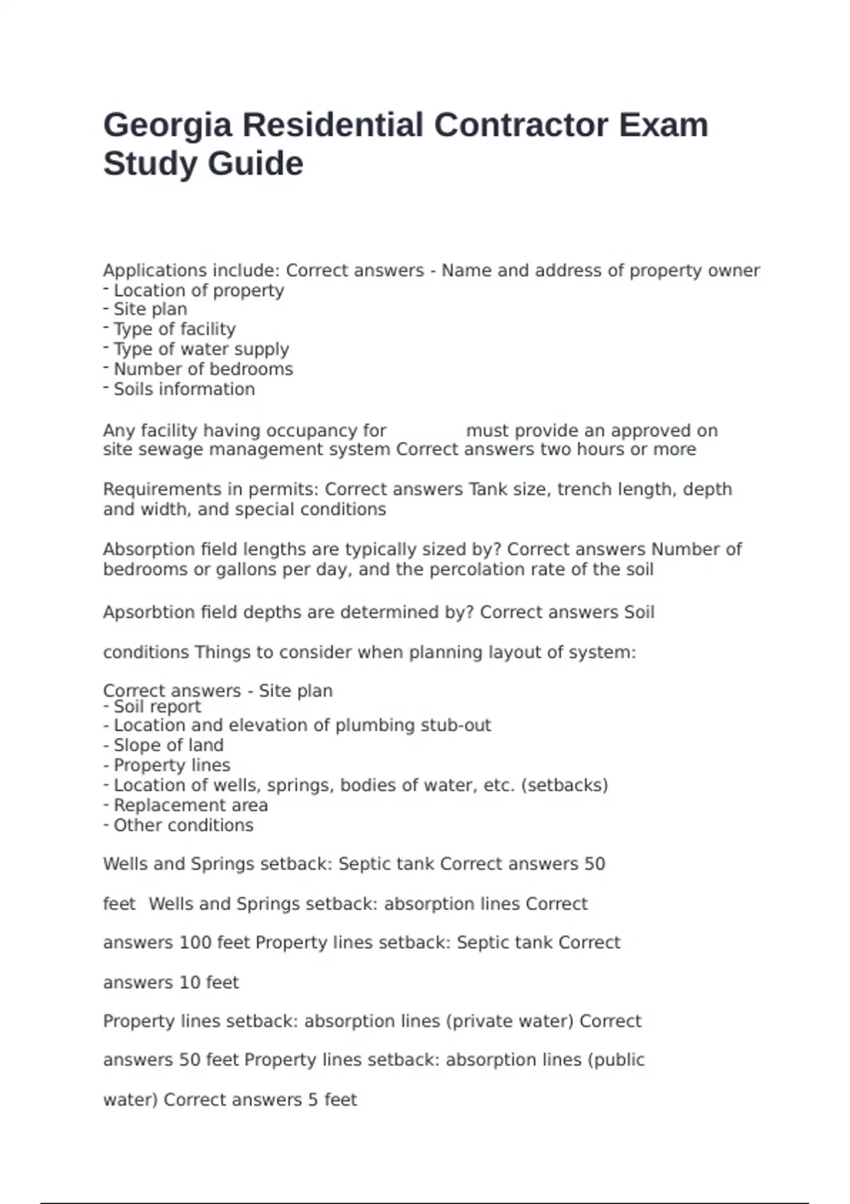 answers 100 feet Property lines setback: Septic tank Correct