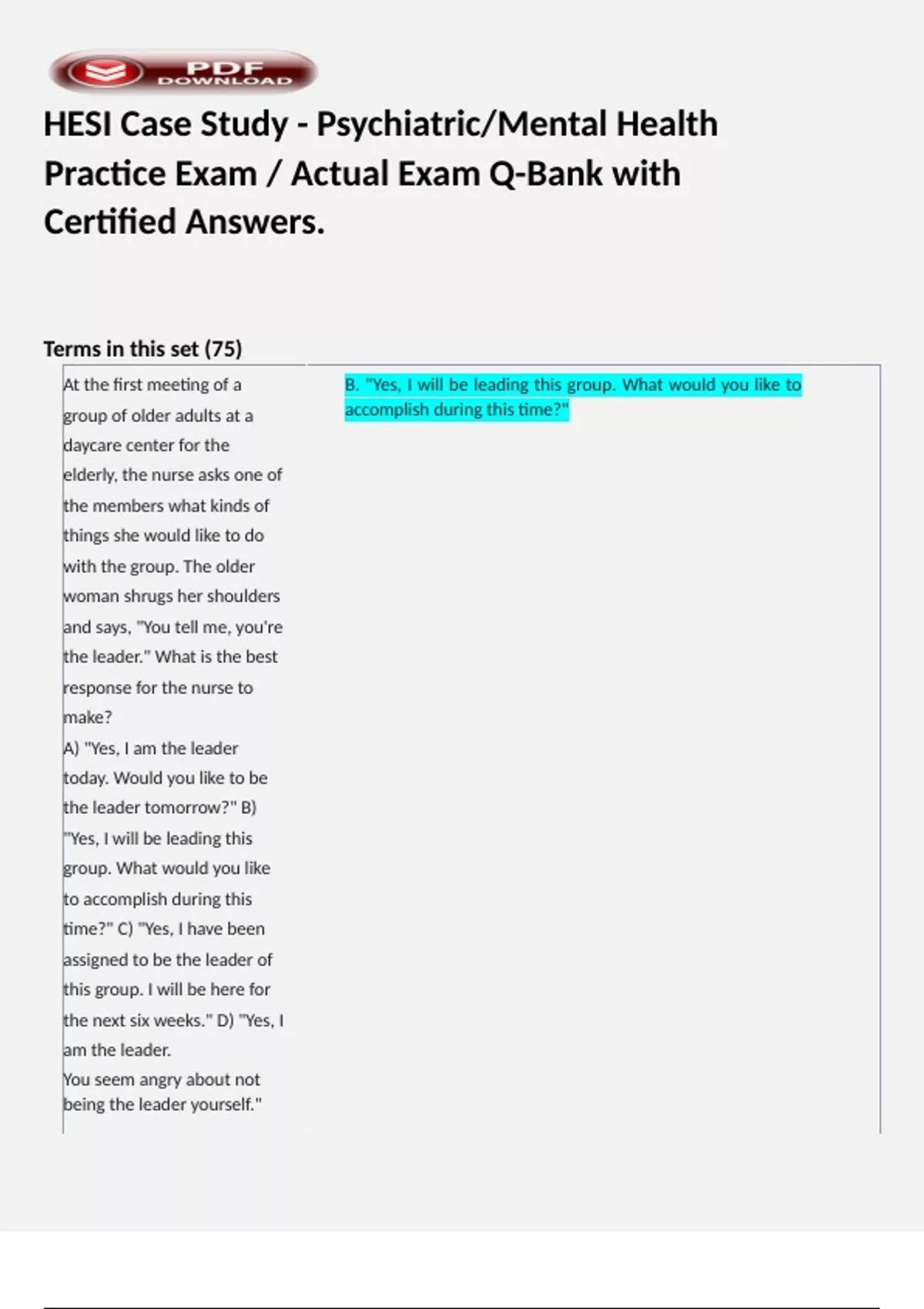 HESI Case Study - Psychiatric/Mental Health Practice Exam / Actual Exam Q-Bank with Certified Answers. Terms in this set (75) At the first meeting of a group of older adults at a daycare center for the elderly, the nurse asks one of the members what kinds of things she would like to do with the group. The older woman shrugs her shoulders and says, "You tell me, you're the leader." What is the best response for the nurse to make? A) "Yes, I am the leader today. Would you like to be the leader tomorrow?" B) "Yes, I will be leading this group. What would you like to accomplish during this time?" C) "Yes, I have been assigned to be the leader of this group. I will be here for the next six weeks." D) "Yes, I am the leader. You seem angry about not being the leader yourself." B. "Yes, I will be leading this group. What would you like to accomplish during this time?"   Over a period of several weeks, one male participant of a socialization group at a community day care center for the elderly monopolizes most of the group's time and interrupts others when they are talking. What is the best action for the nurse to take in this situation? A) Talk to the client outside the group about his behavior during group meetings. B) Remind the client toallow others in the group a chance to talk. C) Allow the group tohandle the problem. D) Ask the client to joinanother group. C. Allow the group to handle the problem.