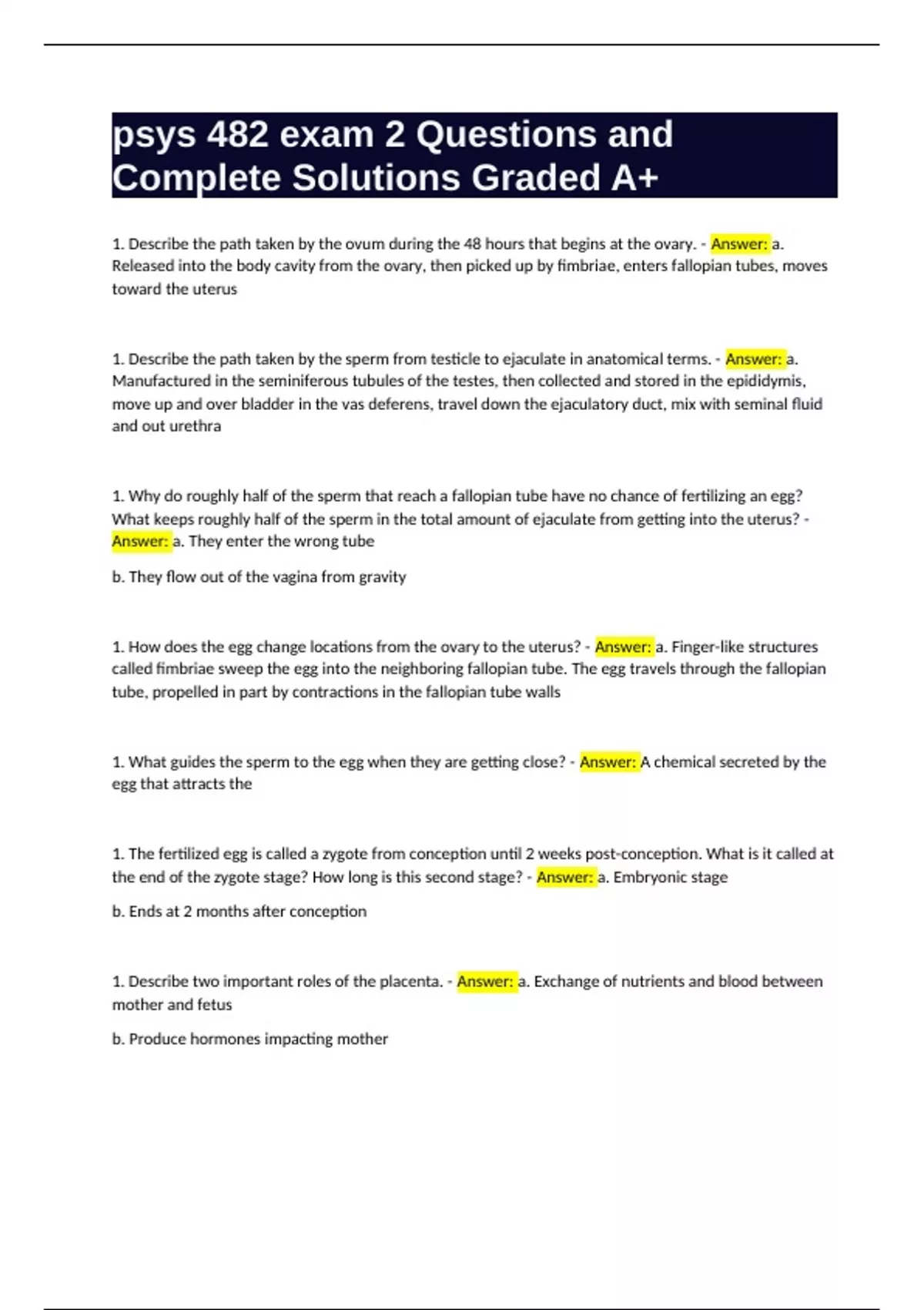 psys 482 exam 2 Questions and Complete Solutions Graded A+ 1. Describe the path taken by the ovum during the 48 hours that begins at the ovary. - Answer: a. Released into the body cavity from the ovary, then picked up by fimbriae, enters fallopian tubes, moves toward the uterus 1. Describe the path taken by the sperm from testicle to ejaculate in anatomical terms. - Answer: a. Manufactured in the seminiferous tubules of the testes, then collected and stored in the epididymis, move up and over bladder in the vas deferens, travel down the ejaculatory duct, mix with seminal fluid and out urethra 1. Why do roughly half of the sperm that reach a fallopian tube have no chance of fertilizing an egg? What keeps roughly half of the sperm in the total amount of ejaculate from getting into the uterus? - Answer: a. They enter the wrong tube b. They flow out of the vagina from gravity 1. How does the egg change locations from the ovary to the uterus? - Answer: a. Finger-like structures called fimbriae sweep the egg into the neighboring fallopian tube. The egg travels through the fallopian tube, propelled in part by contractions in the fallopian tube walls 1. What guides the sperm to the egg when they are getting close? - Answer: A chemical secreted by the egg that attracts the 1. The fertilized egg is called a zygote from conception until 2 weeks post-conception. What is it called at the end of the zygote stage? How long is this second stage? - Answer: a. Embryonic stage b. Ends at 2 months after conception 1. Describe two important roles of the placenta. - Answer: a. Exchange of nutrients and blood between mother and fetus b. Produce hormones impacting mother 1. What are two important roles for the amniotic fluid? - Answer: a. Maintains fetus at constant temperature b. Protects fetus from injury 1. At approximately what week are movements detected? - Answer: a. Week 14 1. Does missing a period mean a woman is pregnant? - Answer: a. No, this could be affected by birth control, stress and other factors that could mess with the hormones in a woman's body. In terms of pregnancy tests, what is a false negative? Are home pregnancy tests very good? - Answer: a. when you are pregnant but the test comes up negative. The most common reason for a false negative is that you took the test too early. b. Many home pregnancy tests claim to be 99 percent accurate. However, home pregnancy tests differ in the ability to diagnose pregnancy in women who have recently missed a period. 1. What proportion of pregnant women experience morning sickness? Describe one theory for why morning sickness occurs. - Answer: a. 2/3 b. To expel and avoid foods containing toxic chemicals Describe the association of testosterone and prolactin with paternal behavior. - Answer: a. High prolactin and low testosterone Is it OK for a pregnant woman to have sex? Given what we learned about female orgasm and the uterus why might it be good for a woman to have regular orgasms prior to giving birth? - Answer: · Yes · To strengthen pelvic muscles Describe three problems associated with fetal alcohol syndrome - Answer: a. Pre and post-natal growth deficiencies b. Small brain c. Joint, limb and heart malformations 1. Describe the three stages of birth. - Answer: a. First stage of labor: contractions, discharge of bloody mucus plug, effacement (thinning out of uterus) and dilation (opening up of uterus) b. Second stage of labor: birth, cervix fully dilated, baby moves from uterus to vagina c. Third stage of labor: placenta detaches from the wall, afterbirth 2. Give three reasons for having a cesarean section. - Answer: If the baby is too large/ the pelvis is too small, labor is too long, umbilical cord prolapses 1. How does the rate of C-sections in the US compare with other western European countries? If a woman has a C-section for one birth do subsequent births have to be C- sections? - Answer: a. Higher than most western countries b. No 1. Describe two specific benefits of Lamaze and one misunderstanding associated with idealistic prepared childbirth? - Answer: a. Conservation of energy and avoidance of the tension that increases the perception of pain b. Anesthetics cannot be used 1. Why should anesthesia be used during birth? Why shouldn't it be used? Who should decide whether it should be used? - Answer: a. Because it is unnecessary for women to suffer when modern medicine can relieve that b. There are dangerous to the mother and the fetus, slow and prolong labor, depress the fetus nervous system and numb a woman to the most fundamental experience of her life 1. Three forms of depression with varying degree of severity can occur in a woman following birth. What are they? What symptoms differentiate the forms of depression and how common are they? - Answer: a. Postpartum blues: mood swings, periods of feeling depressed, irritability, crying alternating with positive moods (50-80%) b. Postpartum depression: depressed mood, insomnia, tearfulness, feelings of inadequacy, fatigue (15%) c. Postpartum psychosis: restlessness, irritability, sleep disorders, disorganized behaviors, mood swings, delusions, and hallucinations (1-2/1000) 1. How do prolactin and oxytocin influence lactation? What secretes these hormones for lactation? - Answer: a. Prolactin stimulates the breasts to produce milk and oxytocin stimulates the breasts to secrete milk b. Pituitary 1. What is the effect of breast-feeding on ovulation and the likelihood of becoming pregnant? - Answer: a. Inhibits ovulation, less likely but still possible 1. Can breastfeeding cause sexual arousal in the woman? Is this wrong? - Answer: a. Yes, and no because it is necessary for the infant's survival so it should be rewarding for the mother 1. What are amniocentesis and chorionic villus sampling? Specify what is sampled and when the procedure can take place. - Answer: a. Amniocentesis: inserting a fine tube through the pregnant woman's abdomen to remove some amniotic fluid to test for chromosomal d