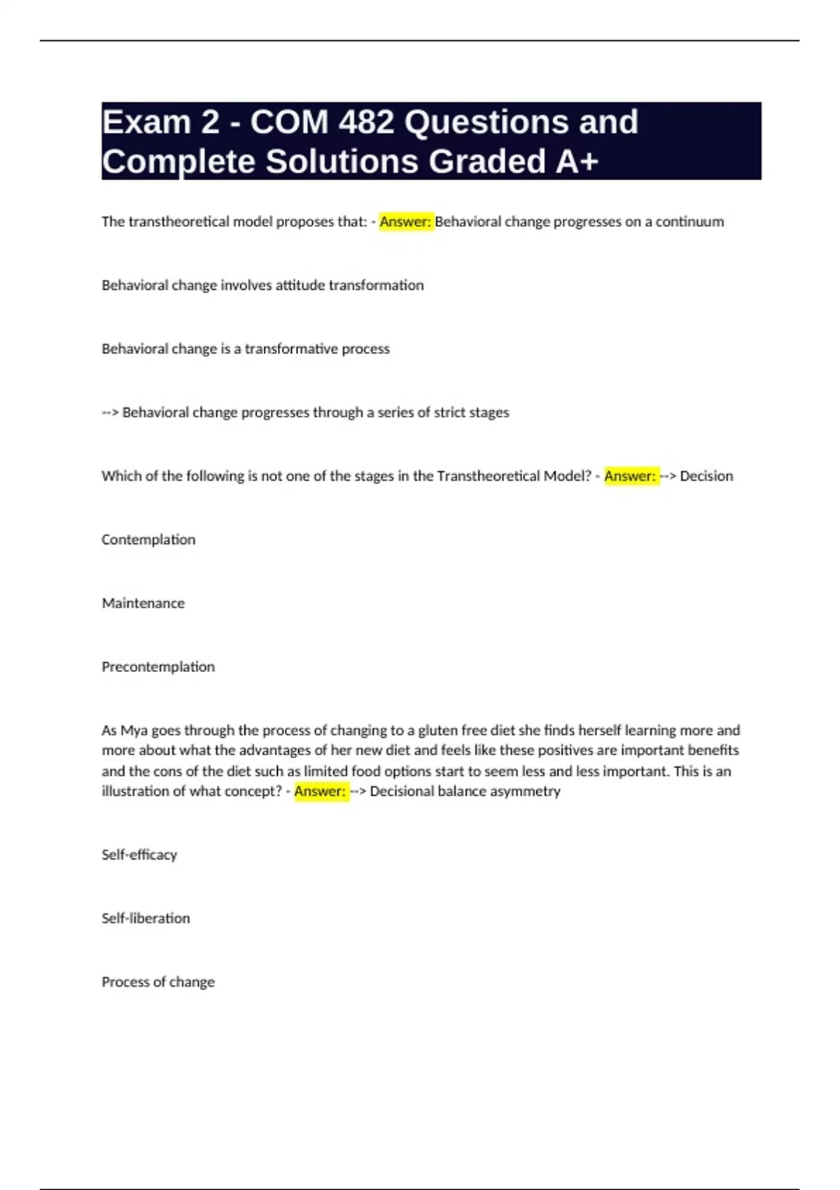 Exam 2 - COM 482 Questions and Complete Solutions Graded A+ The transtheoretical model proposes that: - Answer: Behavioral change progresses on a continuum Behavioral change involves attitude transformation Behavioral change is a transformative process --> Behavioral change progresses through a series of strict stages Which of the following is not one of the stages in the Transtheoretical Model? - Answer: --> Decision Contemplation Maintenance Precontemplation As Mya goes through the process of changing to a gluten free diet she finds herself learning more and more about what the advantages of her new diet and feels like these positives are important benefits and the cons of the diet such as limited food options start to seem less and less important. This is an illustration of what concept? - Answer: --> Decisional balance asymmetry Self-efficacy Self-liberation Process of change Which of the following are the routes to persuasion identified by the ELM? - Answer: Peripheral and heuristic Central and heuristic --> Central and peripheral Central and outer Marie is in the market to purchase a new car. When a car commercial comes on TV she is more likely to use which route of persuasion to evaluate the message: - Answer: --> Central Both Neither Peripheral Adam finds himself disagreeing with the speaker who has come to talk his class about why they should start buying more locally produced foods as he thinks the speaker is very pretentious and is coming off like he thinks he is better than others because of his food decisions. Adam was most likely using what strategy to make his decision? - Answer: Liking heuristic --> Consensus heuristic Evaluation of the message strength Credibility heuristic (Wrong Answer) When setting up an experiment, researchers must define a variable in one of two ways. One can define variables in terms of: - Answer: Observed effects and message length --> Message features and observed effects Message features and intended effects Observed effects and message valence Meghan runs an experiment using a single-message design with one message using a logical appeal and one using an emotional appeal and found that the message with the logical appeal was more persuasive. From her results she can: - Answer: --> Generalize that logical appeals are more persuasive Only cautiously conclude that the logical appeal cause the persuasion Conclude that emotional appeals are less effective Conclude absolutely that the logical appeal cause the persuasion (Wrong Answer) Communicator credibility is comprised of which two dimensions? - Answer: --> Expertise and trustworthiness Logic and experience Expertise and logic Trustworthiness and experience The explanation for why disliked communicators are sometimes more persuasive than liked communicators is because: - Answer: Sometimes disliked communicators have a more impressive educational background Disliked communicators will often argue for a proattitudinal message Messages sometimes perceive them as more authoritative --> Message receivers experience more cognitive dissonance and through dissonance reduction have a great attitude change Adam is a sophomore and is listening to a speaker in his finance class talk about the importance of starting to save for a retirement as soon as possible. Adam is pretty focused on his life right now and has a hard time imagining being out of college, let alone being retired. Because of this, his perception of the speaker's credibility is: - Answer: More important because this information is new information to him --> Less important because he is not engaged in the message Less important because the issue is not personally relevant More important because the issue is not personally relevant (WRONG ANSWER) The Unimodel of Persuasion proposes that: - Answer: --> The route of persuasion one uses depend on his or her underlying belief structure There is one underlying process used to analyze persuasive messages Persuasion is best achieved when focusing on just one route to persuasion The peripheral and central routes are quantitatively different (WRONG ANSWER) One possible explanation for why more specific recommendations in a persuasive message are more persuasive than less specific recommendations is: - Answer: --> Specific recommendations increase perceptions of the speaker's expertise Message receivers engage in less elaboration when there is more detail Less specific recommendations might not be as well understood by the message receivers Specific messages lead to higher perceptions of self-efficacy (WRONG ANSWER) Maria is presenting to her class on why she thinks that vaccines should be mandatory for all children. She goes through each of the reasons why parents may not want to vaccinate their children and explains why these are not sound reasons. Maria is a use what type of message? - Answer: One-sided refutational One-sided --> Two-sided refutational Two-sided non-refutational According to Protection Motivation Theory, which two broad processes influence the adoption of protective behaviors? - Answer: Threat appraisal and response appraisal Threat appraisal and efficacy appraisal Threat appraisal and severity appraisal --> Threat appraisal and coping appraisal How does Need for Cognition (NFC) influence persuasion? - Answer: --> People with higher NFC are more likely to elaborate on the message NFC increase the likelihood that a person will attend to the message People with lower NFC are more likely to elaborate on the message It increases one's ability to process persuasive arguments What are the stages of the TTM in the correct order? - Answer: --> Precontemplation, contemplation, planning, action, maintenance Elaboration, contemplation, planning, action, maintenance Precontemplation, contemplation, dissonance, action, maintenance precontemplation, contemplation, maintenance, planning, action The finding that as people move through the stages of behavior change the perceived importance of the pros o