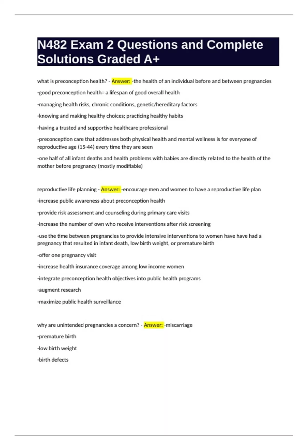 N482 Exam 2 Questions and Complete Solutions Graded A+ what is preconception health? - Answer: -the health of an individual before and between pregnancies -good preconception health= a lifespan of good overall health -managing health risks, chronic conditions, genetic/hereditary factors -knowing and making healthy choices; practicing healthy habits -having a trusted and supportive healthcare professional -preconception care that addresses both physical health and mental wellness is for everyone of reproductive age (15-44) every time they are seen -one half of all infant deaths and health problems with babies are directly related to the health of the mother before pregnancy (mostly modifiable) reproductive life planning - Answer: -encourage men and women to have a reproductive life plan -increase public awareness about preconception health -provide risk assessment and counseling during primary care visits -increase the number of own who receive interventions after risk screening -use the time between pregnancies to provide intensive interventions to women have have had a pregnancy that resulted in infant death, low birth weight, or premature birth -offer one pregnancy visit -increase health insurance coverage among low income women -integrate preconception health objectives into public health programs -augment research -maximize public health surveillance why are unintended pregnancies a concern? - Answer: -miscarriage -premature birth -low birth weight -birth defects -late entry into prenatal care -societal costs key health behaviors for men that improve preconception health - Answer: -maintaining a healthy weight -no smoking -good sleeping habits -exercising/being active -decrease stress -schedule an annual wellness check well-man visits - Answer: -ensures pregnancies are planned and wanted -improves the male genetic and biologic contributions to the pregnancy -improves reproductive health and outcomes for female partners -improves capacity for and understanding of parenthood -enhances overall health through access to primary care tying all concepts of preconception care together - Answer: -early experiences: mother's health before conception, exposure in utero -events during critical periods of development: early childhood, adolescence -presence of risks and cumulative experiences: impact of multiple stresses; exposure to tobacco use, substance use, housing and food insecurity, lack of education and access to health and contraception services, domestic violence, immigration status and racial discrimination -protective factors: economic security, access to health care, access to eduction, nurturing family, positive relationships, safe neighborhoods very preterm - Answer: <32 weeks moderate preterm - Answer: 32-34 weeks late preterm - Answer: 34 to 36 weeks 6 days early term - Answer: 37 to 38 weeks 6 days full term - Answer: 39 to 40 weeks 6 days late term - Answer: 41 to 41 weeks 6 days post term - Answer: 42+ weeks menstrual cycle - Answer: -28 day cycle -mid cycle= ovulation (egg expelled from follicle) zygote - Answer: early fertilizer human egg implantation - Answer: day 7 to 8 post fertilization placental development - Answer: -made from trophoblast cells of the chorionic villi -maternal-placental-embryonic circulation is in place by day 17 -embryonic blood circulating by end of 3rd week -structurally complete by 12w grows until 20w stages of development - Answer: -ovum: conception to day 14; not susceptible to teratogens -embryo: day 15 to 8 weeks; most critical time for development; all organ systems and external features present by the end -fetus: 9 weeks to birth pregnancy dating - Answer: -pregnancy is dating from first day of LMP -10 lunar months (28 day cycles) -40 weeks -280 days -266 days post conception pregnancy vs fetal development dating - Answer: -pregnancy from first day of LMP -fetal development from conception developmental goal for early pregnancy - Answer: -acceptance of pregnancy -life changes -family formation -easiest for 55% of people experiencing planned pregnancies -other 45% of people may have difficulties accepting pregnancy relationship adaptations in pregnancy - Answer: -partners: pregnant people need love and acceptance of pregnancy -existing children (siblings): need preparation for new family member -grandparents: pregnant people need support and acceptance fraternal twins - Answer: two eggs, two sperm, two placenta, two sets of membranes, two babies identical twins - Answer: one egg, one sperm first missed menses - Answer: -4 weeks since LMP -2 weeks post fertilization -unplanned pregnancy=45%, planned = 55% pregnancy tests - Answer: -detect beta-hCG in urine or blood -home tests able to detect as early as first missed menses -recommendation is to wait a week to prevent false-negative readings -blood tests --> generally only used for complicated situations signs of pregnancy - Answer: presumptive, probable, positive presumptive sings of pregnancy - Answer: -physiologic changes that a woman experiences -subjective sensations or assessments noted by women -suggestive but not diagnostic of pregnancy -amenorrhea, breast changes, vaginal changes, skin changes, N/V, urinary frequency, fatigue, fetal movement probable sings of pregnancy - Answer: -maternal physiological and anatomical changes that can be observed or palpated by a health care provider on exam -objective findings on clinical exam -suggestive but not diagnostic of pregnancy -enlargement of abdomen, vaginal changes, cervical changes, uterine changes, palpation and ballottement of the fetus, basal body temp elevation, endocrine pregnancy tests positive signs of pregnancy - Answer: -findings directly attributable to the fetus that can be detected by the healthcare provider -considered "absolute" proof of pregnancy -diagnostic of pregnancy -detection of the embryo or fetus by ultrasound or x-ray, identification of fetal heart activity, detection of fetal movement by examiner Certified Nurse Midw