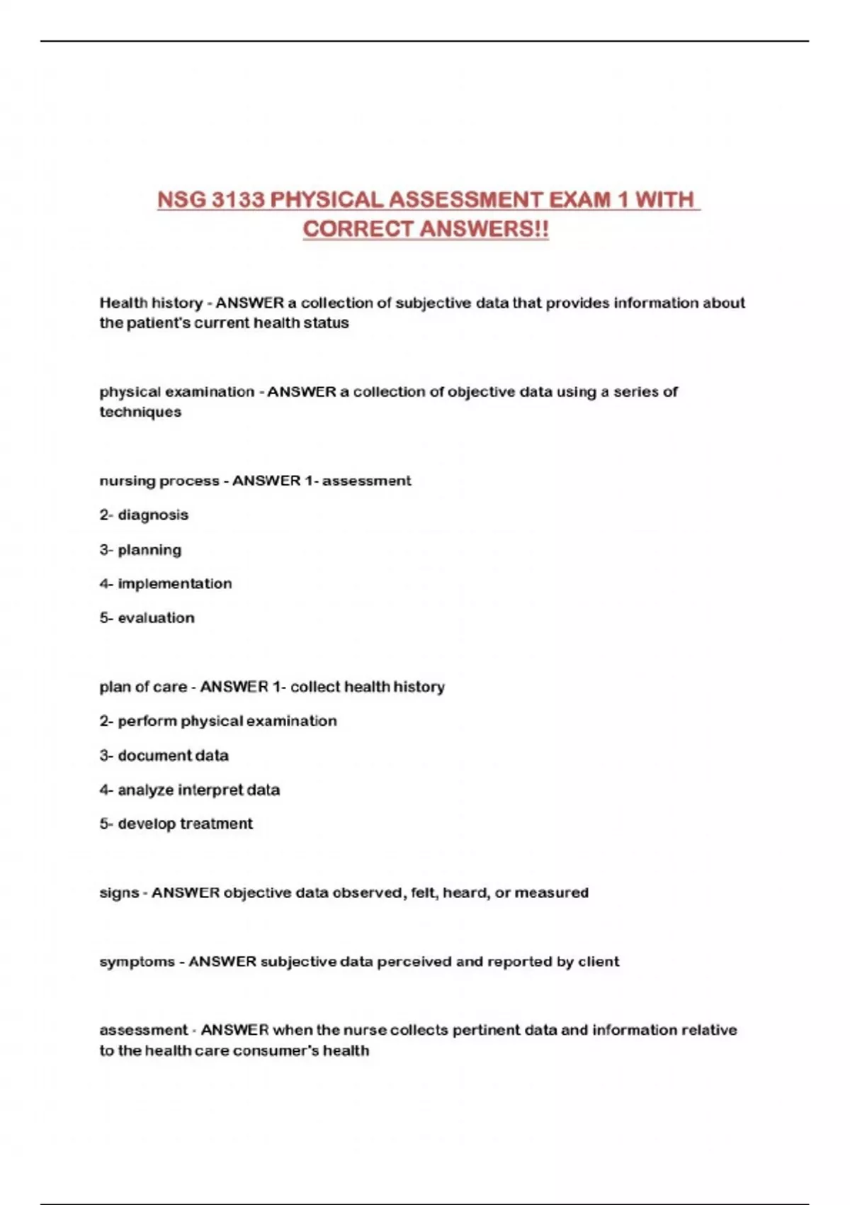 NSG 3133 PHYSICAL ASSESSMENT EXAM 1 WITH CORRECT ANSWERS!!...