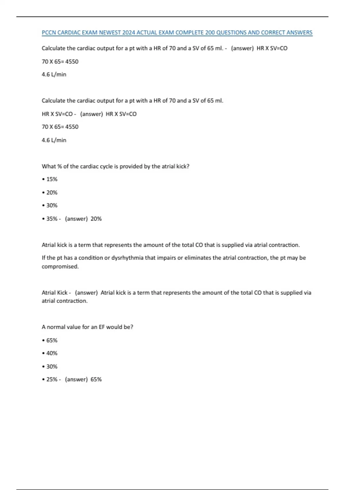 Calculate the cardiac output for a pt with a HR of 70 and a SV of 65 ml. - (answer) HR X SV=CO
