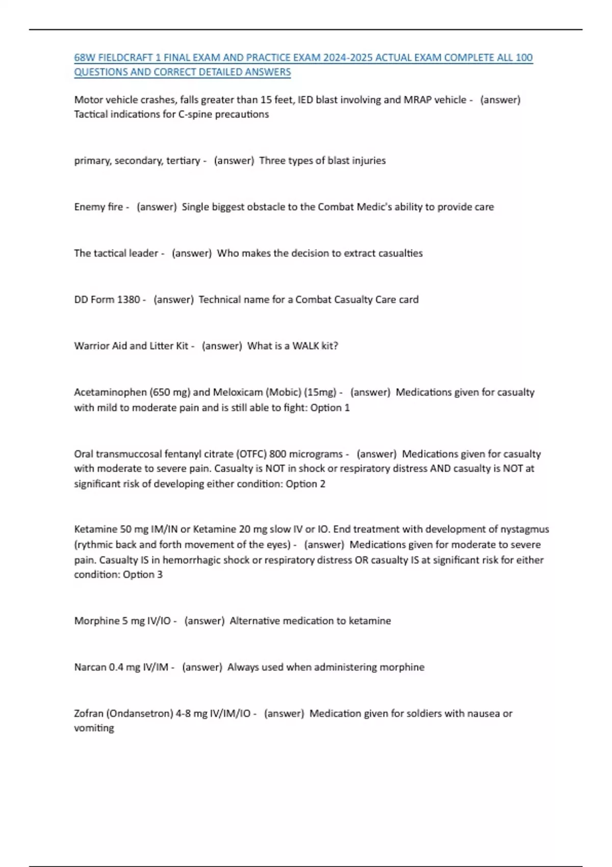 , 68W FIELDCRAFT 1 FINAL EXAM AND PRACTICE EXAM 2024-2025 ACTUAL EXAM COMPLETE ALL 100