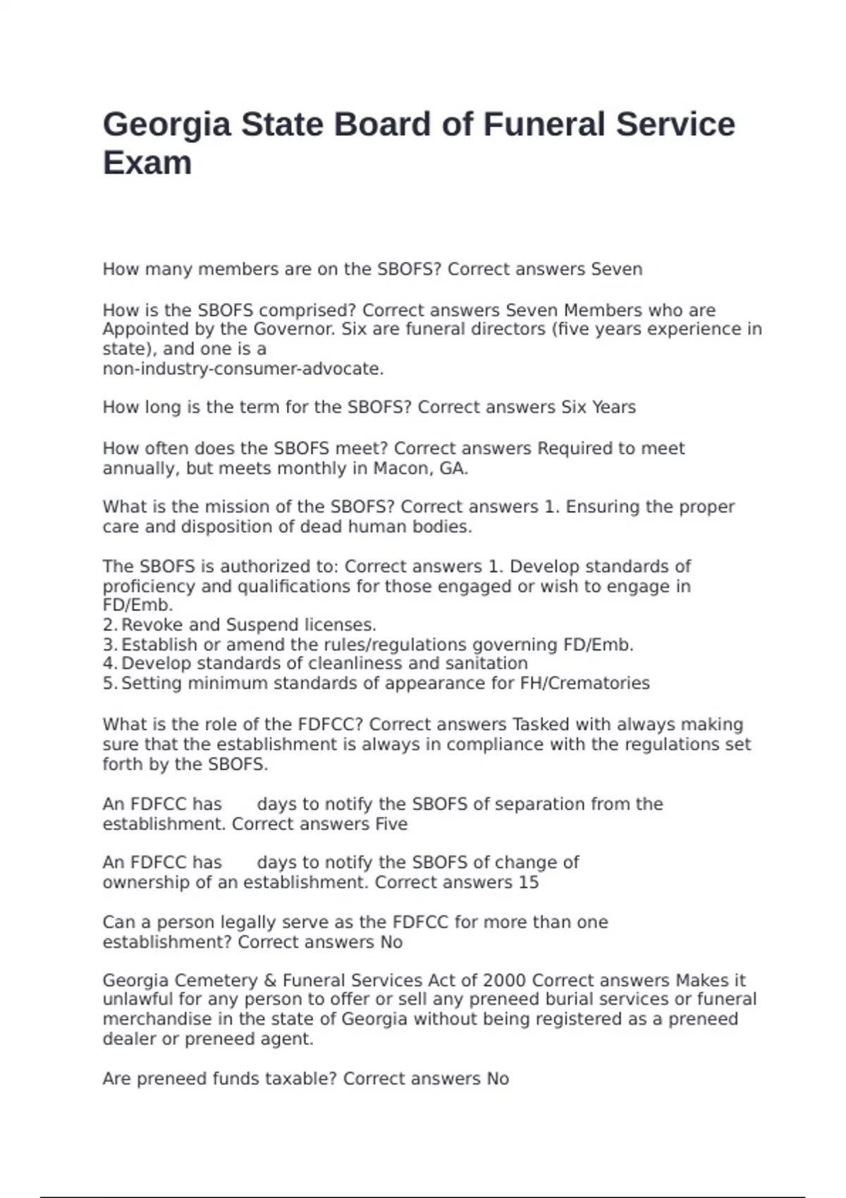 Georgia Cemetery & Funeral Services Act of 2000 Correct answers Makes it