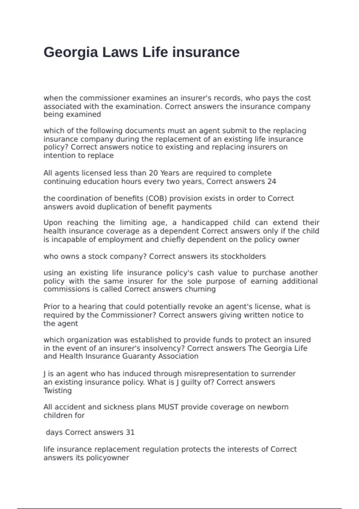 in the event of an insurer's insolvency? Correct answers The Georgia Life