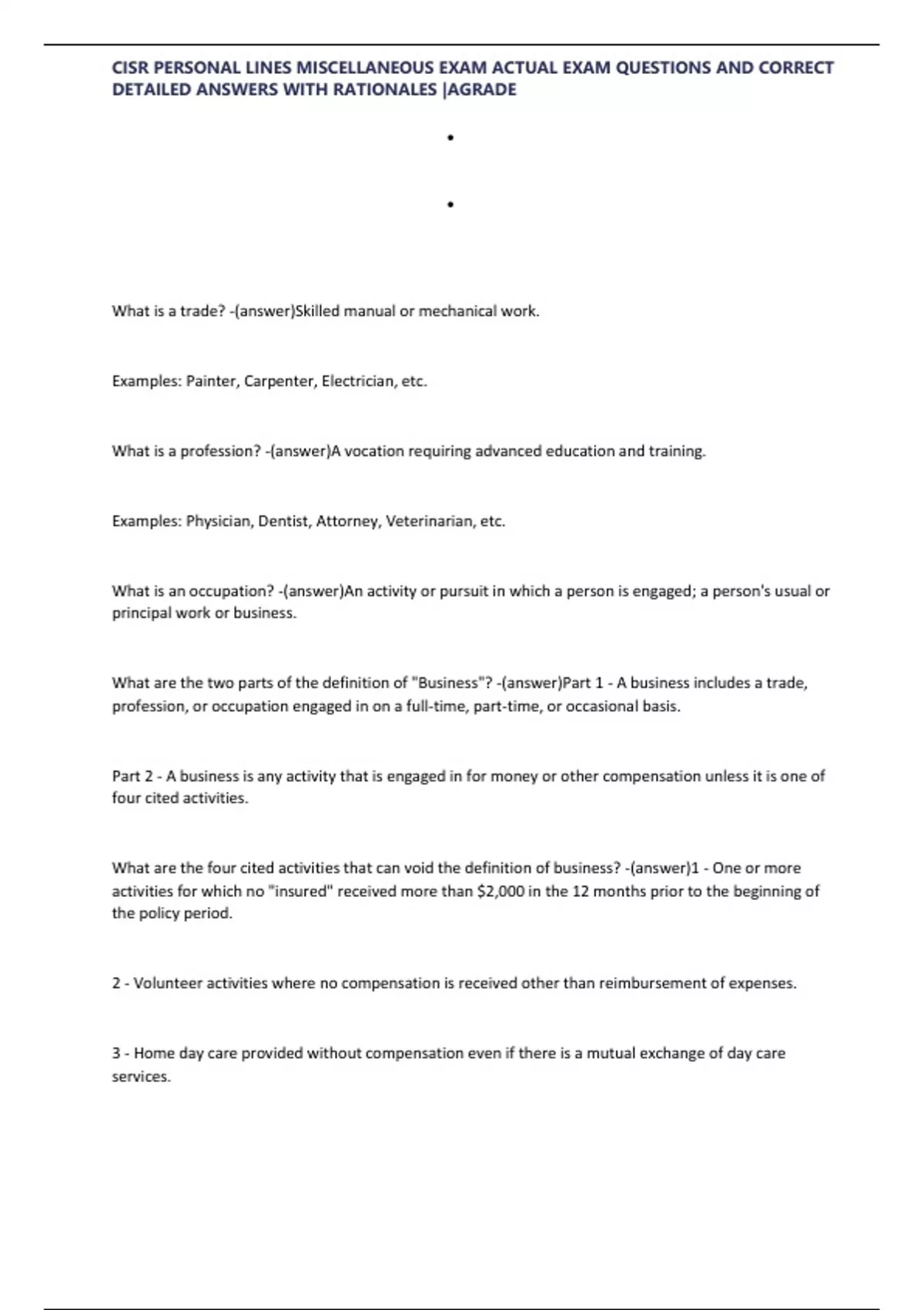CISR PERSONAL LINES MISCELLANEOUS EXAM ACTUAL EXAM 100 QUESTIONS AND CORRECT DETAILED ANSWERS WITH RATIONALES |AGRADE