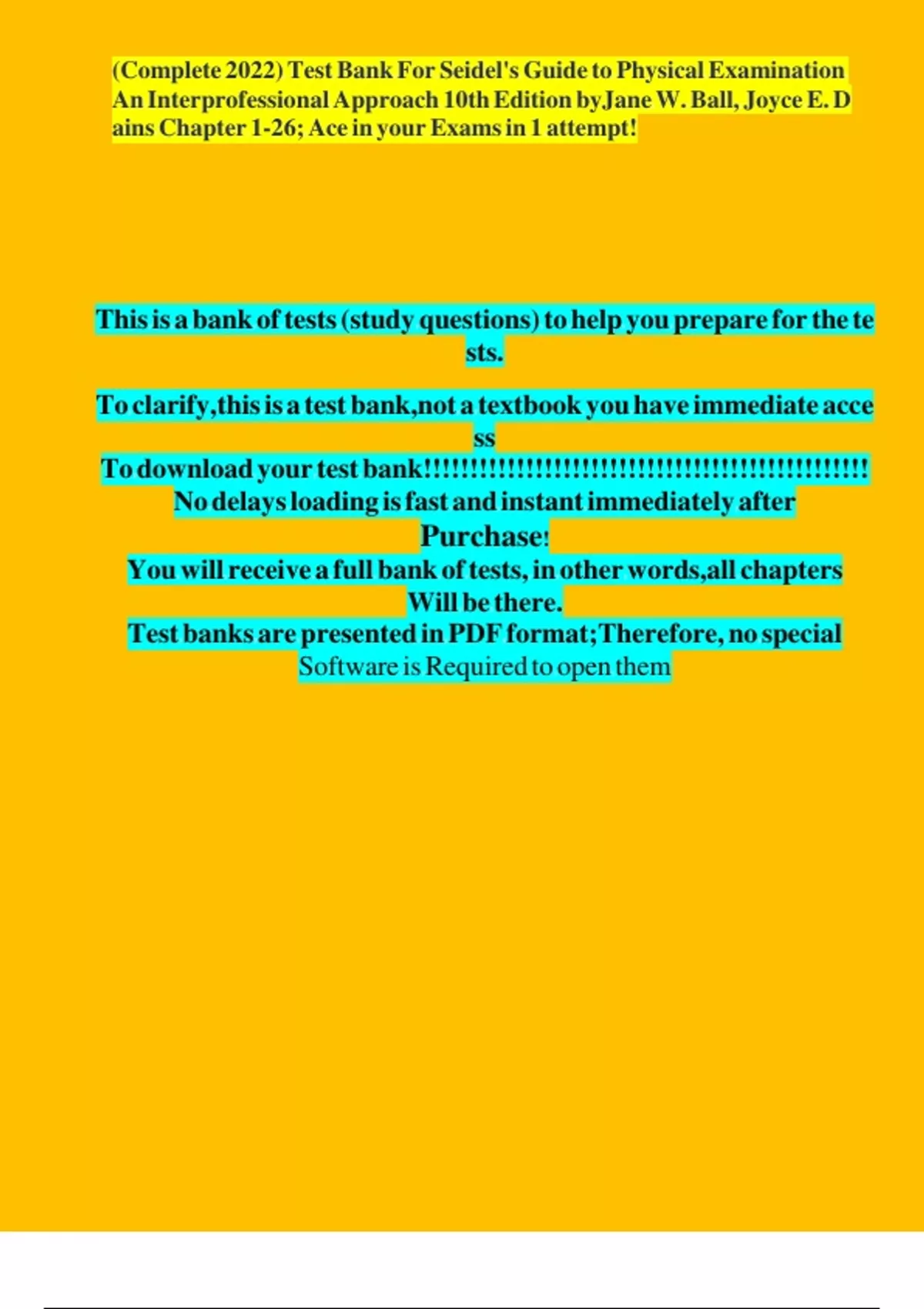 Test Bank For Seidel's Guide to Physical Examination An Interprofessional Approach 10th Edition by Jane W. Ball, Joyce E. Dains Chapter 1-26 A+ COMPLETE GUIDE