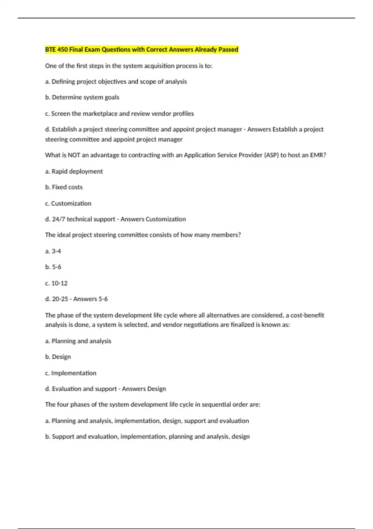 BTE 450 Final Exam Questions with Correct Answers Already Passed One of the first steps in the system acquisition process is to: a. Defining project objectives and scope of analysis b. Determine system goals c. Screen the marketplace and review vendor profiles d. Establish a project steering committee and appoint project manager - Answers Establish a project steering committee and appoint project manager What is NOT an advantage to contracting with an Application Service Provider (ASP) to host an EMR? a. Rapid deployment b. Fixed costs c. Customization d. 24/7 technical support - Answers Customization The ideal project steering committee consists of how many members? a. 3-4 b. 5-6 c. 10-12 d. 20-25 - Answers 5-6 The phase of the system development life cycle where all alternatives are considered, a cost-benefit analysis is done, a system is selected, and vendor negotiations are finalized is known as: a. Planning and analysis b. Design c. Implementation d. Evaluation and support - Answers Design The four phases of the system development life cycle in sequential order are: a. Planning and analysis, implementation, design, support and evaluation b. Support and evaluation, implementation, planning and analysis, design c. Design, implementation, planning and analysis, support and evaluation d. Planning and analysis, design, implementation, support and evaluation - Answers Planning and analysis, design, implementation, support and evaluation (PDISE) Once the project steering committee has been established, one of the first things it should is to: a. Define project goals b. Determine system requirements c. Develop an RFP d. Hold vendor demonstrations - Answers Define project goals What is the final step of the system acquisition process where expectations are outlined and performance requirements are determined with the vendor? a. Vendor demonstrations b. Vendor analysis c. Contract negotiations d. Site visits - Answers Contract negotiations The final summary report developed by the project steering committee should include everything but? a. Systems goals and criteria b. Cost-benefit analysis c. Final recommendation and ranking of vendors d. Project repository - Answers Project repository What is an example of a research organization that produces market analysis reports listing and describing vendors that provide EHR systems? a. HIMSS b. AMIA c. ONC d. KLAS - Answers KLAS The system acquisition process consists of what two phases of the systems development life cycle: a. Planning and Analysis, Design b. Implementation, Support and Evaluation c. Support and Evaluation, Planning and Analysis d. Design, Implementation - Answers Planning and Analysis, Design The primary focus of the planning and analysis phase is on the business problem or the organization's strategy, independent of any technology that can or will be used. - Answers True It is generally advisable to have two or three vendors in the final ranking and recommendations made by the project steering committee: - Answers True An RFP might be used when the health care organization is considering only a small group of vendors or products or when it is still in the exploratory phase. - Answers False After reviewing vendor RFPs and evaluating their product demonstrations, the steering committee should prepare a summary report that includes their final recommendation. - Answers False