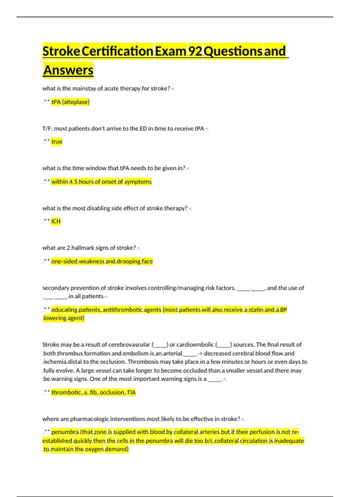 Stroke Certification Exam 92 Questions and sa sa sa sa sa