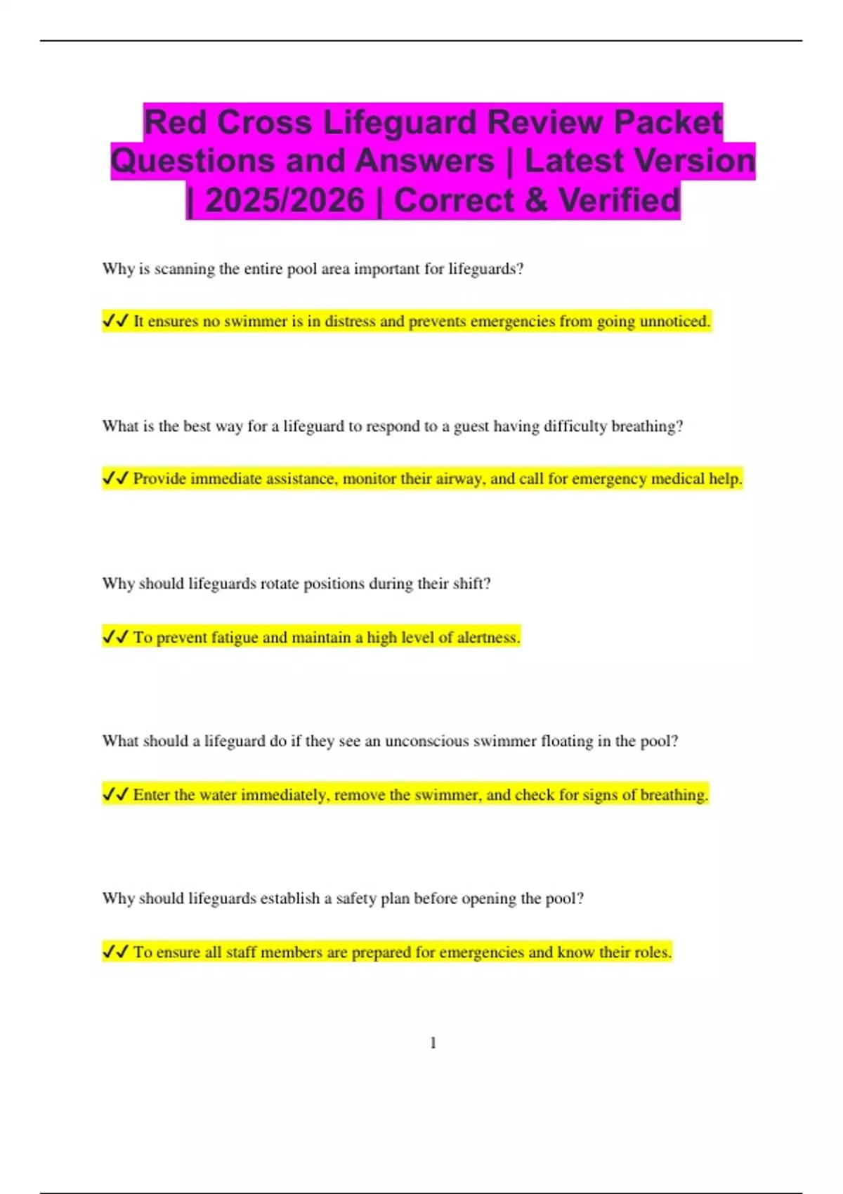 Red Cross Lifeguard Review Packet Questions and Answers | Latest Version | 2025/2026 | Correct & Verified Why is scanning the entire pool area important for lifeguards? It ensures no swimmer is in distress and prevents emergencies from going unnoticed. What is the best way for a lifeguard to respond to a guest having difficulty breathing? Provide immediate assistance, monitor their airway, and call for emergency medical help. Why should lifeguards rotate positions during their shift? To prevent fatigue and maintain a high level of alertness. What should a lifeguard do if they see an unconscious swimmer floating in the pool? Enter the water immediately, remove the swimmer, and check for signs of breathing. Why should lifeguards establish a safety plan before opening the pool? To ensure all staff members are prepared for emergencies and know their roles. 2 What should a lifeguard do if a swimmer suddenly grabs onto them during a rescue? Use a front or rear escape technique to break free while keeping both individuals safe. Why should lifeguards avoid unnecessary conversations while on duty? To stay focused on scanning and prevent distractions. What should a lifeguard do if they suspect a guest has a head, neck, or spinal injury? Keep the guest as still as possible and use spinal immobilization techniques. Why is it important for lifeguards to enforce pool rules consistently? It promotes safety and prevents accidents before they occur. What should a lifeguard do if a swimmer appears to be hyperventilating? Encourage them to take slow, controlled breaths and monitor their condition. Why is it important for lifeguards to know CPR and first aid? To provide lifesaving care in emergencies before medical personnel arrive. 3 What should a lifeguard do if they see a person running on a wet pool deck? Warn them immediately and remind them of the risks of slipping and falling. Why should lifeguards use a rescue tube during all water rescues? It provides flotation support for both the rescuer and the victim. What should a lifeguard do if lightning is spotted near the pool area? Clear the pool immediately and direct guests to a safe indoor location. Why should lifeguards practice quick and effective water entries? To reduce response time and reach distressed swimmers as fast as possible. What should a lifeguard do if a guest faints near the pool? Check their breathing, call for emergency help, and place them in the recovery position if necessary. Why should lifeguards know the signs of a distressed swimmer? Early recognition can prevent a swimmer from becoming an active drowning victim.
