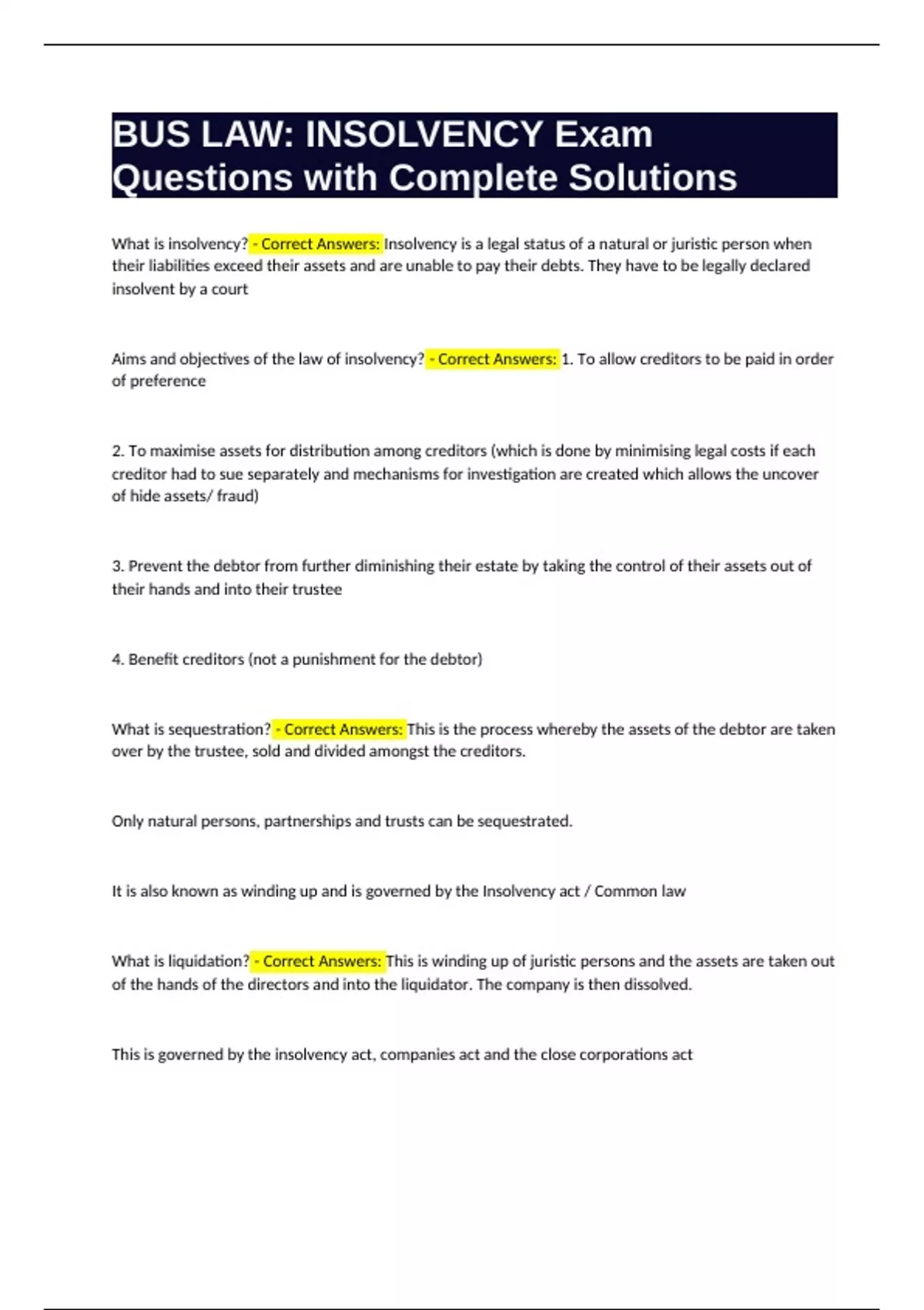 BUS LAW INSOLVENCY Exam Questions with Complete Solutions.