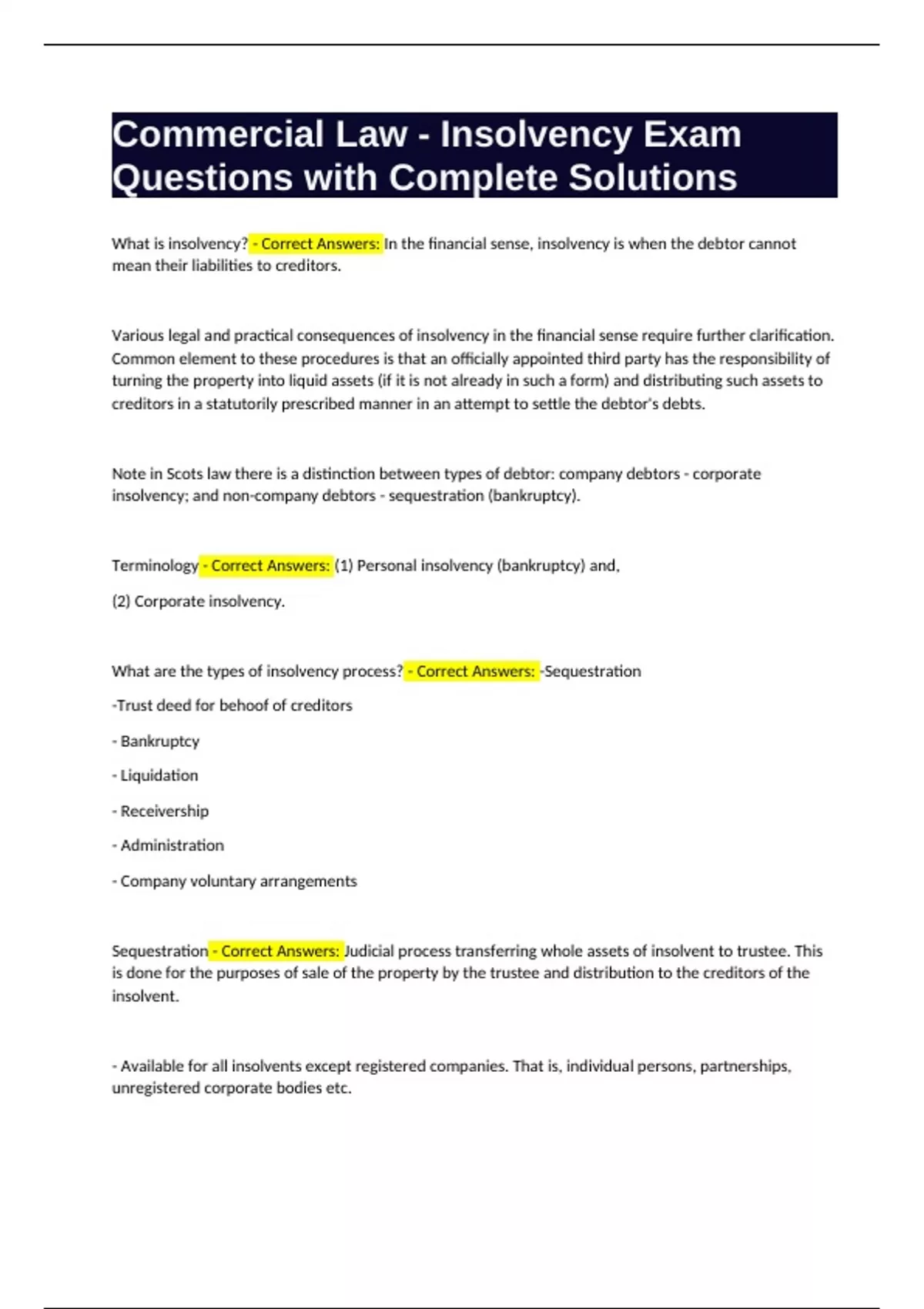 Commercial Law - Insolvency Exam Questions with Complete Solutions.