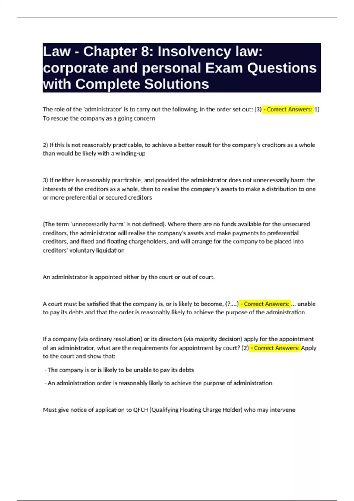 Law - Chapter 8 Insolvency law corporate and personal Exam Questions with Complete Solutions.