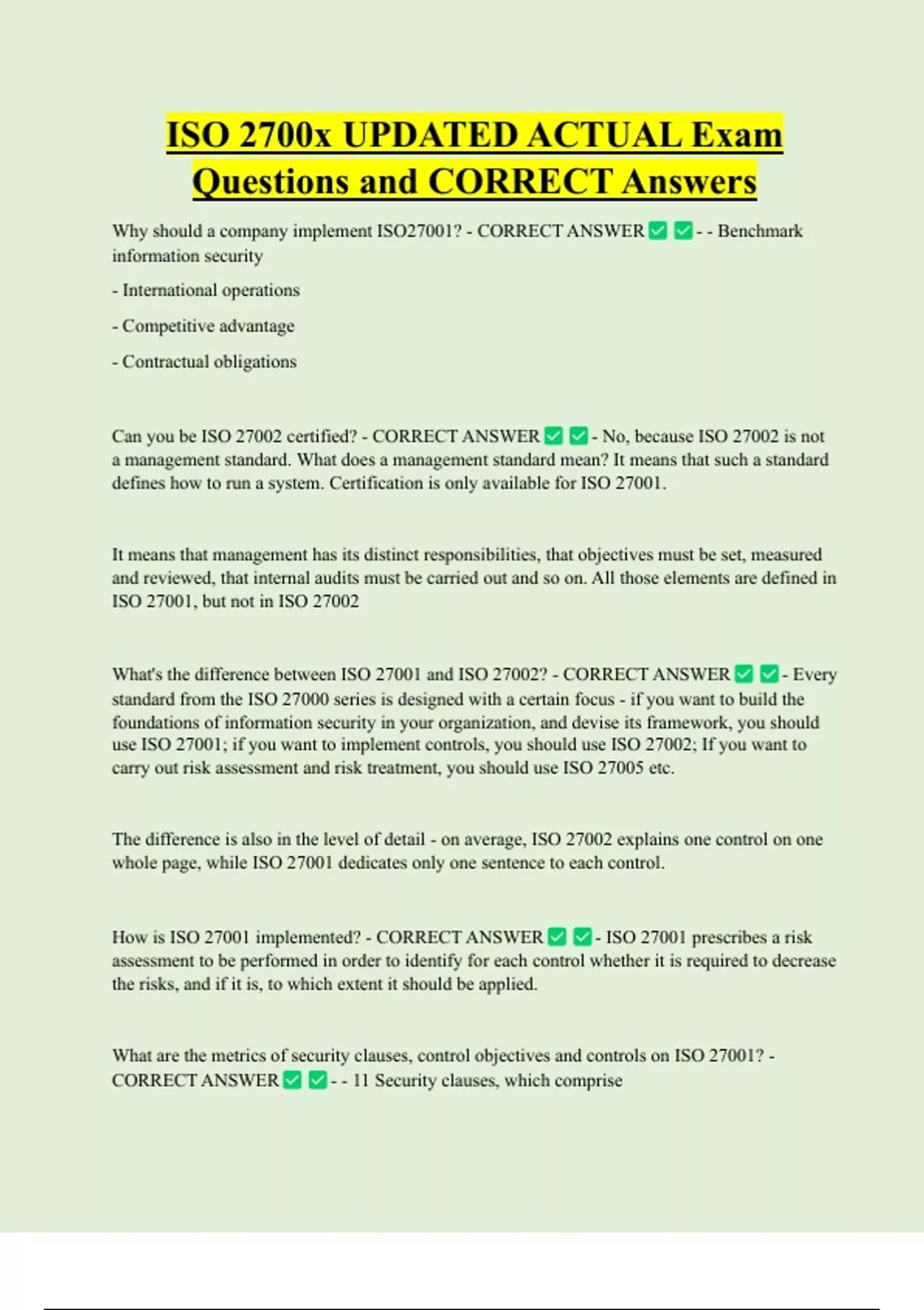 ISO 2700x UPDATED ACTUAL Exam Questions and CORRECT Answers Why should a company implement ISO27001? - CORRECT ANSWER information security - International operations - Competitive advantage - Contractual obligations Can you be ISO 27002 certified? - CORRECT ANSWER - - Benchmark - No, because ISO 27002 is not a management standard. What does a management standard mean? It means that such a standard defines how to run a system. Certification is only available for ISO 27001