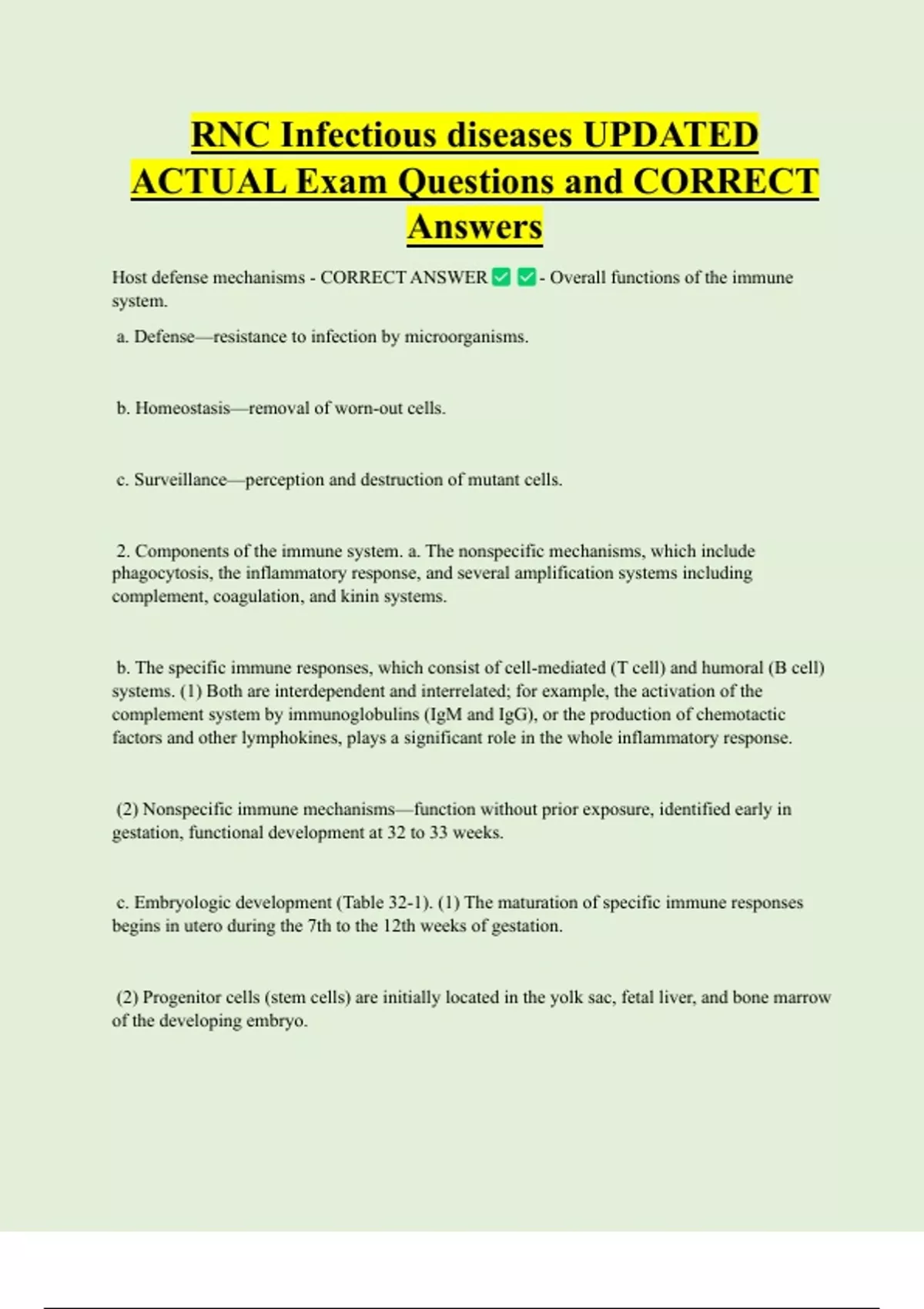RNC Infectious diseases UPDATED ACTUAL Exam Questions and CORRECT Answers Host defense mechanisms - CORRECT ANSWER system. a. Defense—resistance to infection by microorganisms. b. Homeostasis—removal of worn-out cells. - Overall functions of the immune c. Surveillance—perception and destruction of mutant cells