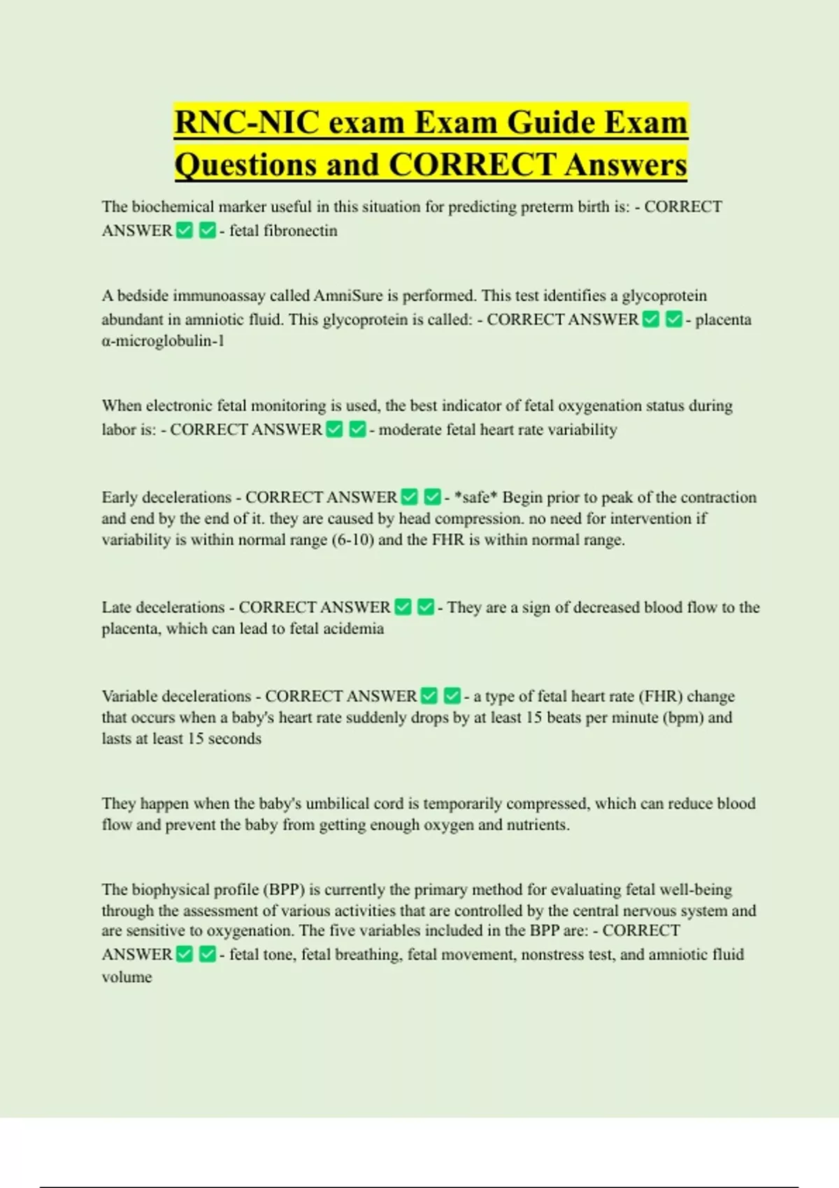 RNC-NIC exam Exam Guide Exam Questions and CORRECT Answers The biochemical marker useful in this situation for predicting preterm birth is: - CORRECT ANSWER - fetal fibronectin A bedside immunoassay called AmniSure is performed. This test identifies a glycoprotein abundant in amniotic fluid. This glycoprotein is called: - CORRECT ANSWER - placenta α-microglobulin-1 When electronic fetal monitoring is used, the best indicator of fetal oxygenation status during labor is: - CORRECT ANSWER - moderate fetal heart rate variability