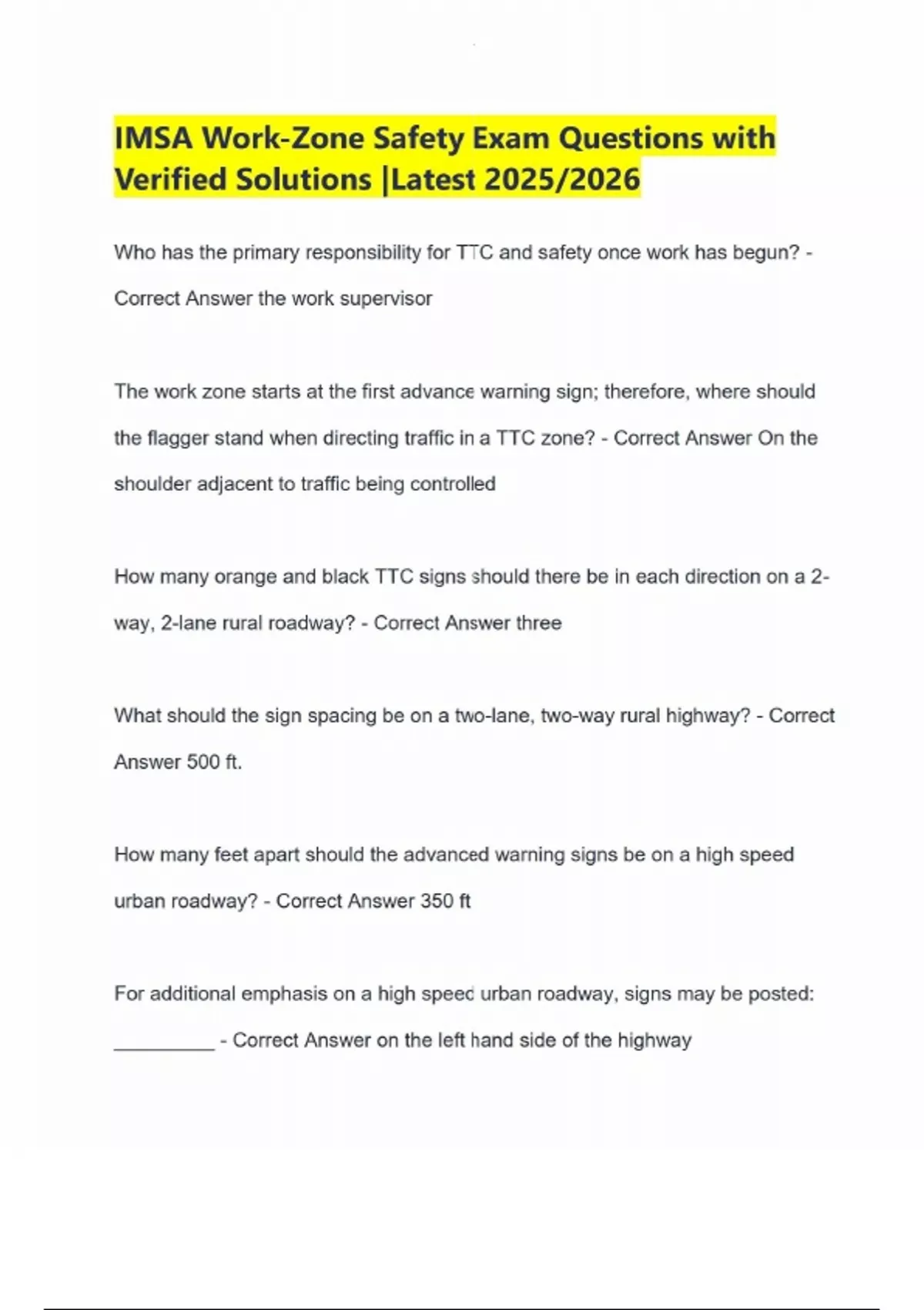 IMSA Work-Zone Safety Exam Questions with Verified Solutions |Latest 2025/2026 Who has the primary responsibility for TTC and safety once work has begun? - Correct Answer the work supervisor The work zone starts at the first advance warning sign; therefore, where should the flagger stand when directing traffic in a TTC zone? - Correct Answer On the shoulder adjacent to traffic being controlled How many orange and black TTC signs should there be in each direction on a 2-way, 2-lane rural roadway? - Correct Answer three What should the sign spacing be on a two-lane, two-way rural highway? - Correct Answer 500 ft. How many feet apart should the advanced warning signs be on a high speed urban roadway? - Correct Answer 350 ft For additional emphasis on a high speed urban roadway, signs may be posted: _________ - Correct Answer on the left hand side of the highway Taper length refers to: - Correct Answer The distance required to safely route traffic from one lane to another