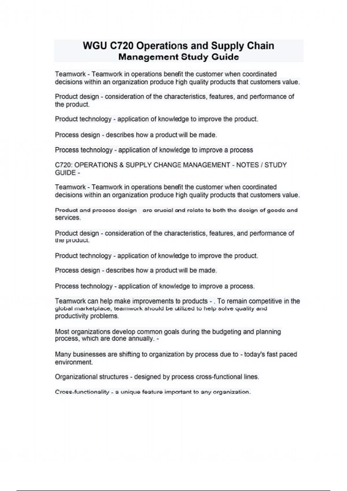 Teamwork - Teamwork in operations benefit the customer when coordinated decisions within an organization produce high quality products that customers value. Product design - consideration of the characteristics, features, and performance of the product. Product technology - application of knowledge to improve the product. Process design - describes how a product will be made. Process technology - application of knowledge to improve a process C720: OPERATIONS & SUPPLY CHANGE MANAGEMENT - NOTES / STUDY GUIDE - Teamwork - Teamwork in operations benefit the customer when coordinated decisions within an organization produce high quality products that customers value. Product and process design - are crucial and relate to both the design of goods and services. Product design - consideration of the characteristics, features, and performance of the product. Product technology - application of knowledge to improve the product. Process design - describes how a product will be made. Process technology - application of knowledge to improve a process. Teamwork can help make improvements to products - . To remain competitive in the global marketplace, teamwork should be utilized to help solve quality and productivity problems. Most organizations develop common goals during the budgeting and planning process, which are done annually. - Many businesses are shifting to organization by process due to - today's fast paced environment. Organizational structures - designed by process cross-functional lines. Cross-functionality - a unique feature important to any organization. Eliminating functional silos - allows teams to share knowledge and understanding of decision-making across the organization. Decentralizing decision-making leads to more cross-functional teams. Relative advantage - the difference between the lowest cost producer and the nextlowest cost producer Ethics - a sense of what is right and wrong that guide behavior. Sustainability - reflects the efforts organizations are expected to make to balance their interconnected obligations to economic viability, the societies in which they operate, and the natural environment - the "triple bottom line." Organizations need to focus on how a decision affects - profitability, employees, the community, and the environment, in the long and short term. Competitive advantage - a capability that customers value that gives an organization an edge against its competition. VIRAL - Value to consumers, it should be Inimitable (not easily imitated), Rare, and an organization should have the Aptitude and Lifespan to earn appropriate returns on the advantage. SWOT Analysis - assists in planning to achieve objectives. Key processes - organizations must have: strategy development, product development, development of systems to produce services and goods, and order fulfillment to leverage impact. Systems development key to meeting strategic goals. - Resources include: people, facilities, equipment, materials, and energy. Process redesign facilitates working toward a common goal in organizations. - Productivity - a mathematical calculation. It is the ratio of the outputs achieved divided by the inputs consumed to achieve those outputs. Productivity Output / Input. Change in productivity = (new productivity - old productivity) / old productivity. Labor productivity - Quantity or value of units produced divided labor hours or labor cost. Labor Productivity = Quantity or Value of Units Produced / Labor Hours or Labor Costs. Quality - is determined by the customer and how the customer will use a product. to judge service quality: - Reliability- ability to perform the promised service dependably and accurately.Responsiveness- willingness to help customers and provide prompt service. Reliability - ability to perform the promised service dependably and accurately. Responsiveness - willingness to help customers and provide prompt service. Assurance - knowledge and courtesy of employees and their ability to convey trust and confidence. Empathy - provision of caring, individualized attention to customers. Tangibles - appearance of physical facilities, equipment, personnel, and communication materials. Factors that determine quality for goods: - Performance - primary operating characteristic of a product Features - secondary characteristics that supplement the product's basic functioning. Reliability - length of time a product will function before it fails or the probability it will function for a stated period of time. Conformance - degree to which a product's design and operating characteristics match pre-established standards. Durability - ability of a product to function when subjected to hard and frequent use. Serviceability - speed, courtesy and competence of repair. Aesthetics - how a product looks, feels, sounds, tastes, or smells. Perceived quality - image, advertising, or brand name of a product. Failure costs - can be internal to the organization (defects found before product reaches consumer) or external after reaching the customer (cost of warranty repair work, handling complaints, or replacing products). Failure costs can lead to: lost goodwill, legal liability if someone is injured/killed, and even loss of customers. Appraisal costs - investment in measuring the quality and assessing customer satisfaction. Appraisal costs include: costs involved with customer satisfaction surveys, hiring individuals to inspect property at a hotel chain, or testing computers to ensure they will operate as intended. Prevention costs - put a stop to the quality problem. Prevention costs include: activities such as employee training, quality control procedures or other activities designed to prevent product defects. Statistical process control (SPC) - the use of statistical methods to determine when a process that produces a good or service is getting close to producing an unacceptable level of defects. Walter Shewhart - father of statistical quality control. Founding father of statistical