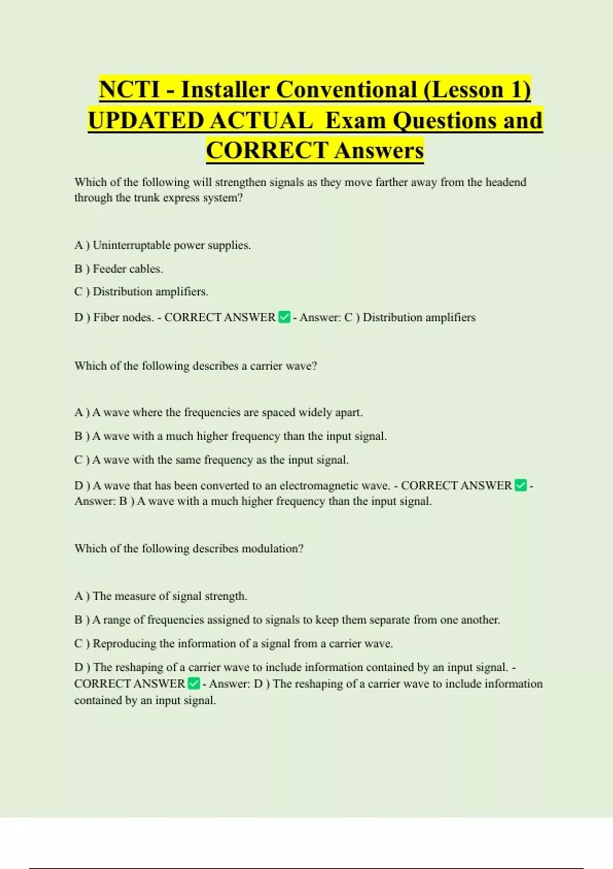 NCTI - Installer Conventional (Lesson 1) UPDATED ACTUAL Exam Questions and CORRECT Answers Which of the following will strengthen signals as they move farther away from the headend through the trunk express system? A ) Uninterruptable power supplies. B ) Feeder cables. C ) Distribution amplifiers. D ) Fiber nodes. - CORRECT ANSWER - Answer: C ) Distribution amplifiers