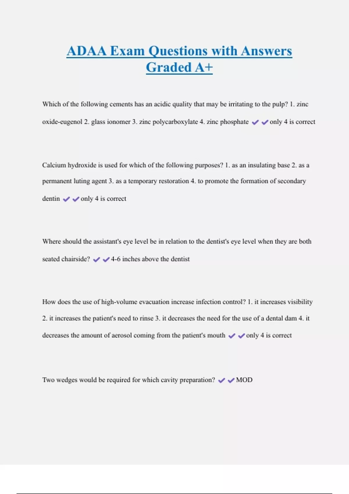 ADAA Exam Questions with Answers Graded A+ Which of the following cements has an acidic quality that may be irritating to the pulp? 1. zinc oxide-eugenol 2. glass ionomer 3. zinc polycarboxylate 4. zinc phosphate only 4 is correct Calcium hydroxide is used for which of the following purposes? 1. as an insulating base 2. as a permanent luting agent 3. as a temporary restoration 4. to promote the formation of secondary dentin only 4 is correct